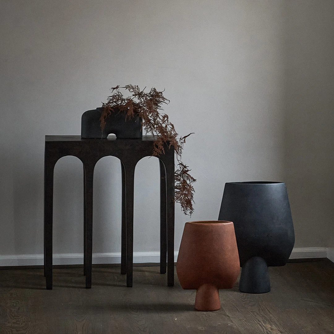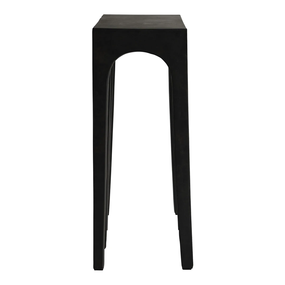 Like a piece of architecture gone astray, the Bow console table draws parallels to the old aqueducts from the Roman Empire and classic architectural geometry. Repetition of arches create a beautiful, sleek, yet somewhat box silhouette and the long legs make it seem narrow and light even though the character is anything but insignificant. The table is cast in lightweight fiber concrete to create a unique textured surface and increase mobility. It is hand painted with multiple layers of paint, creating a strong and resistant surface. Designed by Kristian Sofus Hansen & Tommy Hyldahl.