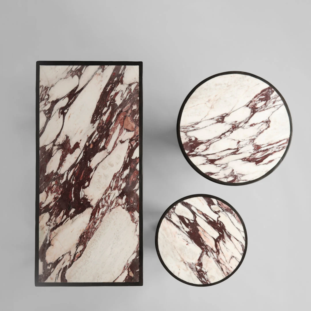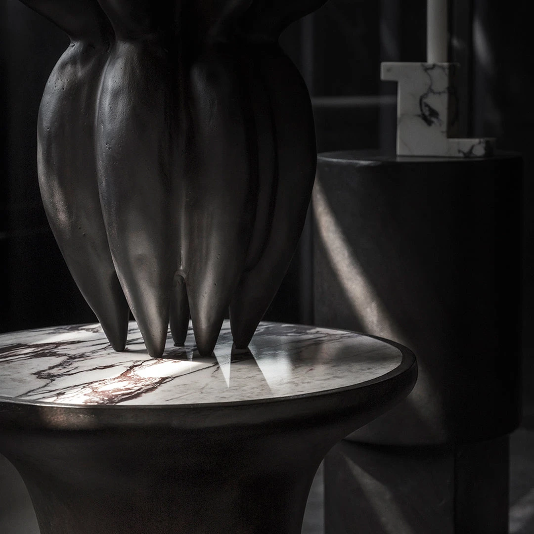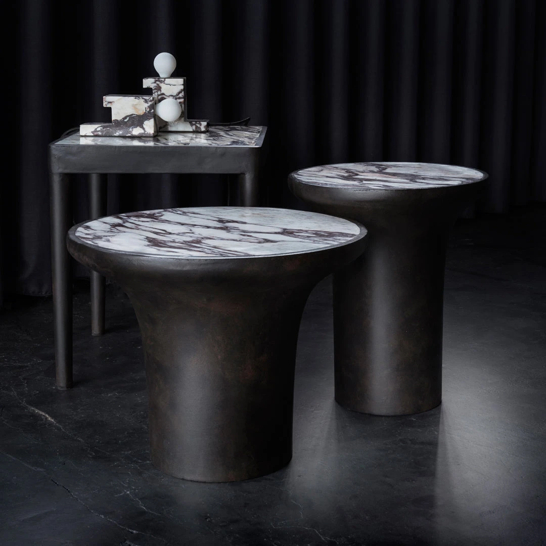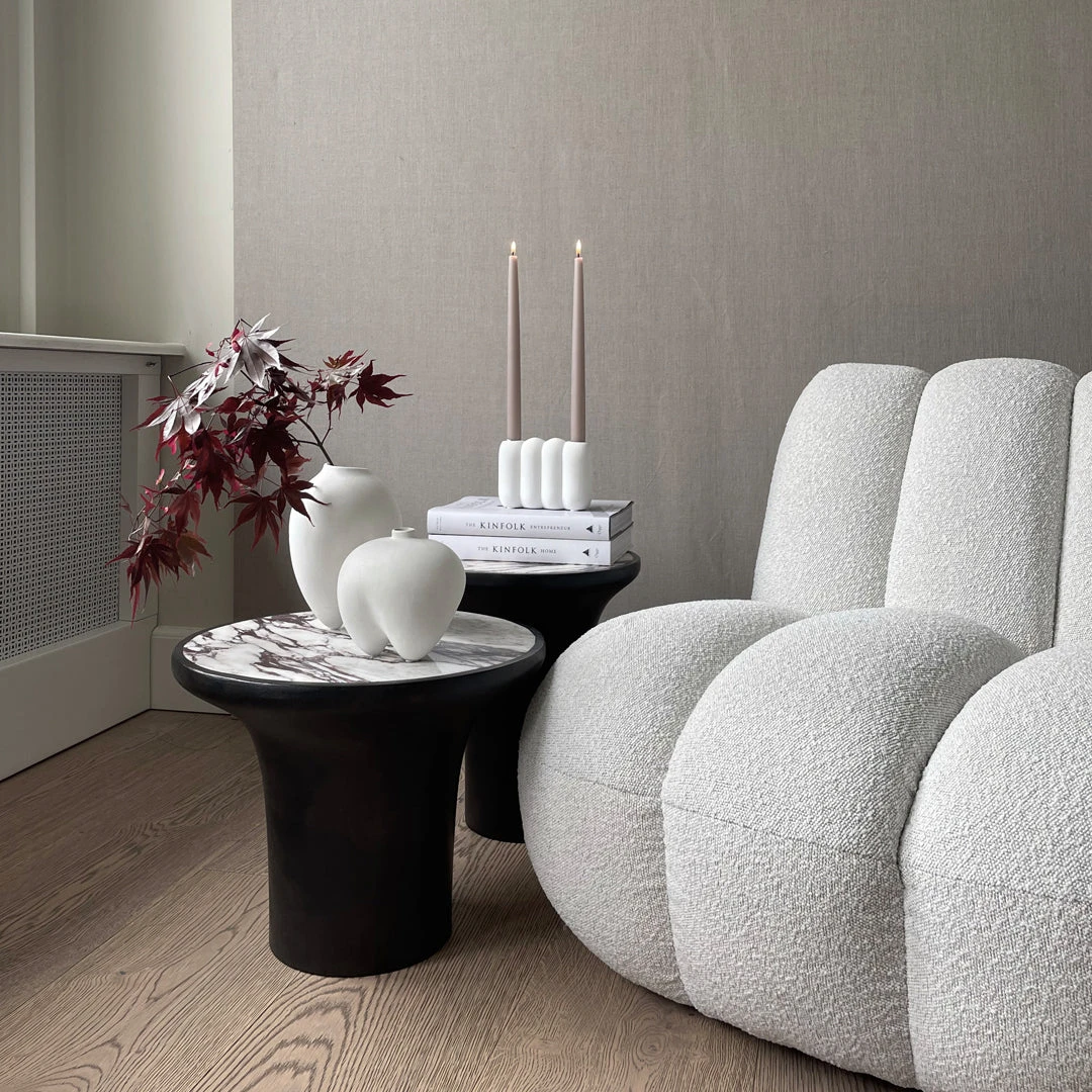 Inspired by Brutalism Architecture from the 1970’s, the Trumpet Tables are designed as a trumpet shape with a soft curve and a circular tabletop. Trumpet is all about clean geometric shapes and embracing the beauty of natural materials. Made from a base of fiber concrete, the Trumpet tables features a tabletop of exquisite marble, emphasising the rich and beautiful patterns of natural stone. The polished surface softly reflects light, adding a warmth to the Trumpet tables. Designed by Kristian Sofus Hansen & Tommy Hyldahl.