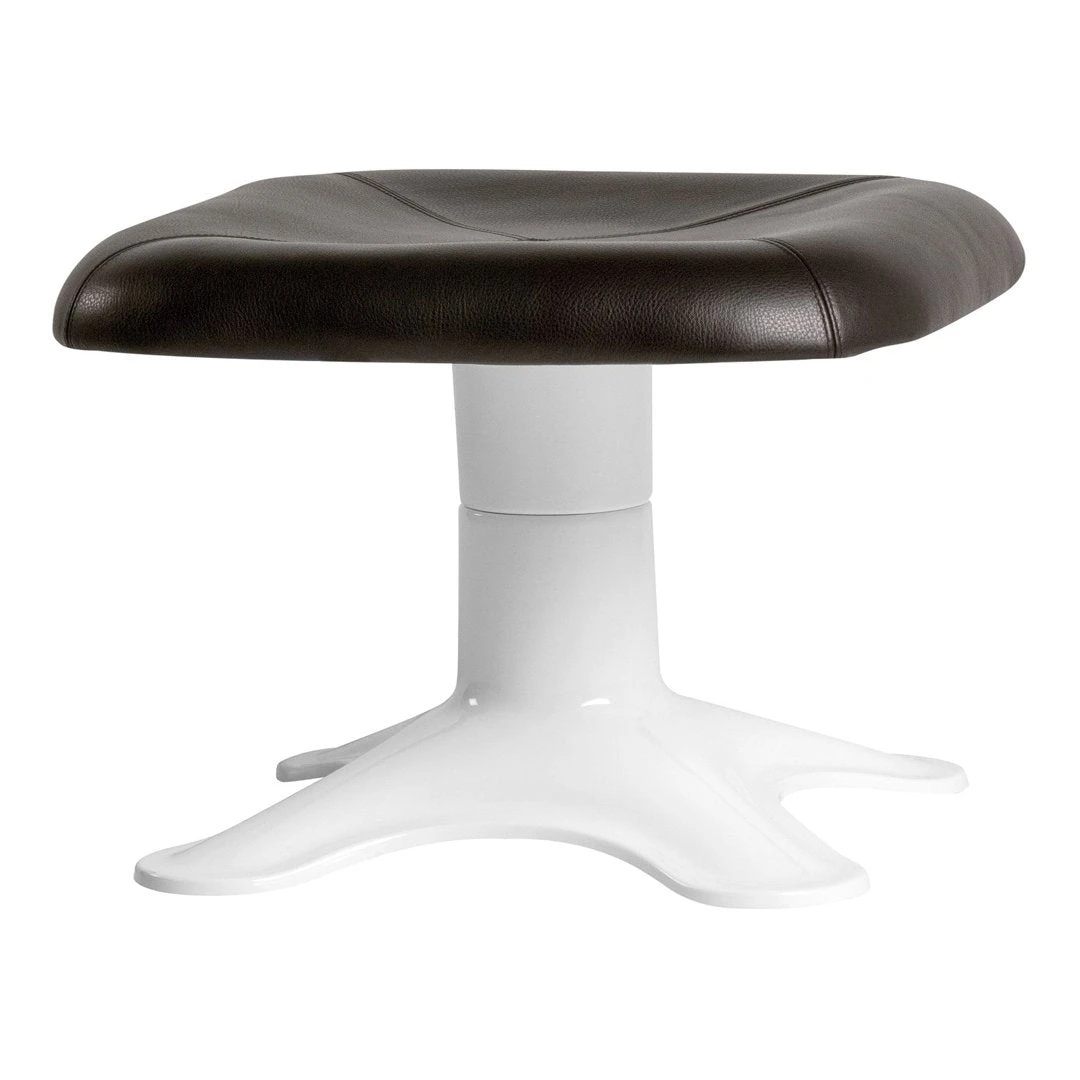 The Karuselli Ottoman is the companion of the Karuselli Lounge Chair and a continuation of designer Yrjö Kukkapuro’s interest in achieving ultimate comfort through a union of function, ergonomics, and organic form. The ottoman consists of an upholstered leather top sitting on a white pedestal base of fibre glass.