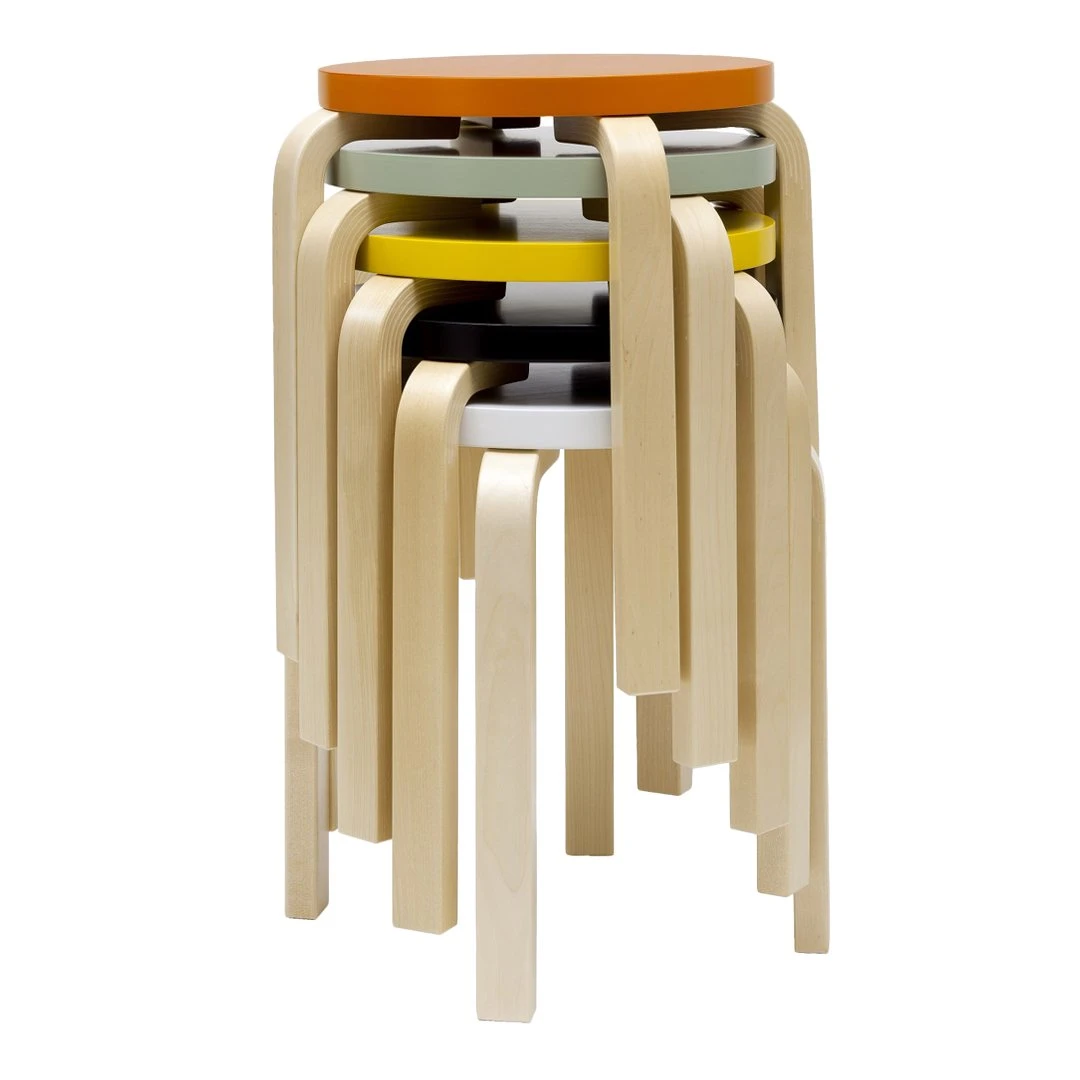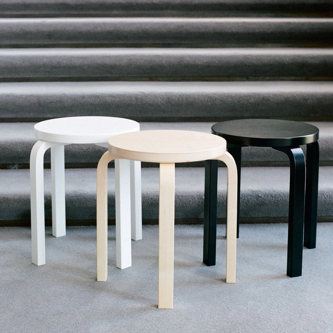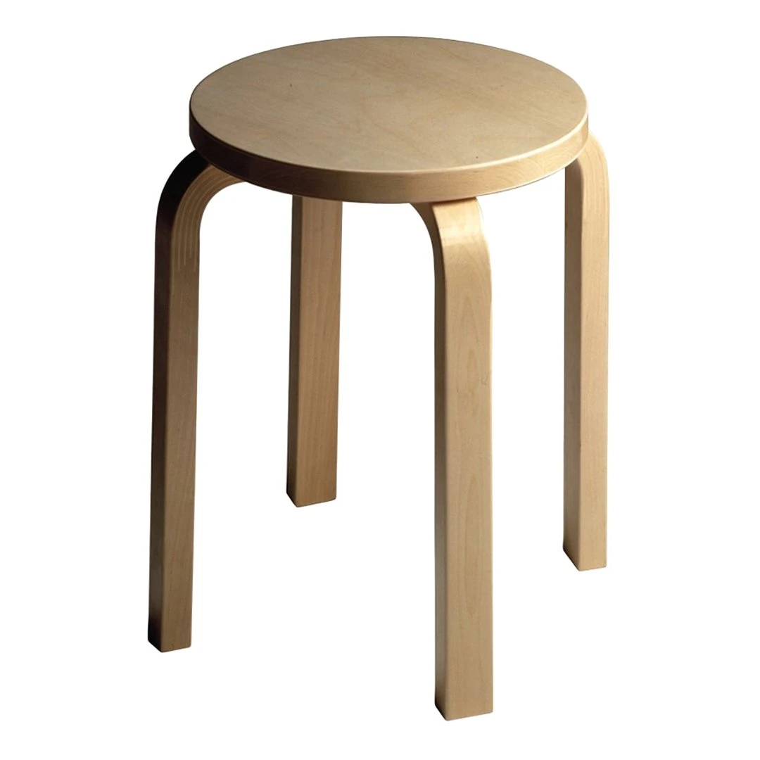Alvar Aalto’s four-legged Stool E60 is the most elemental of furniture pieces, equally suitable as a seat, table, storage unit, or display surface. Projecting a sense of relaxed familiarity, Stool E60 is equally suited to the home, public buildings, and educational facilities. The legs are mounted directly to the underside of the round seat without the need for complicated connecting elements. Thanks to its geometry, the stool can be stacked to save space in a spiralling tower sculpture.