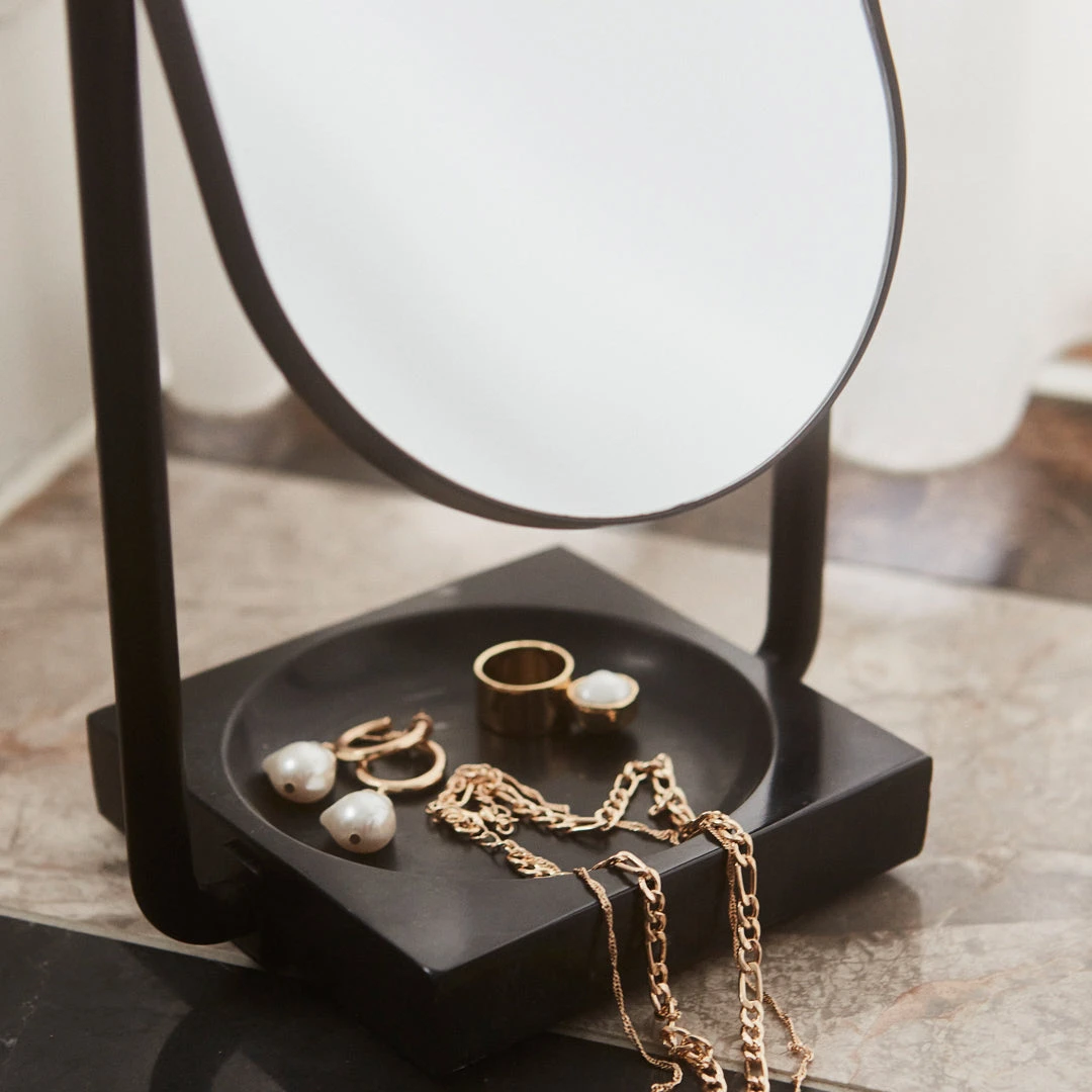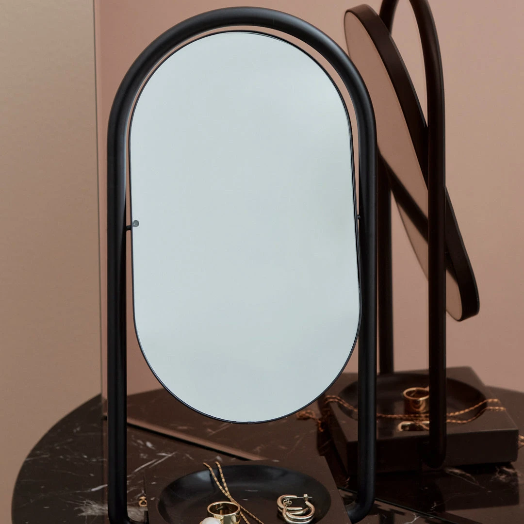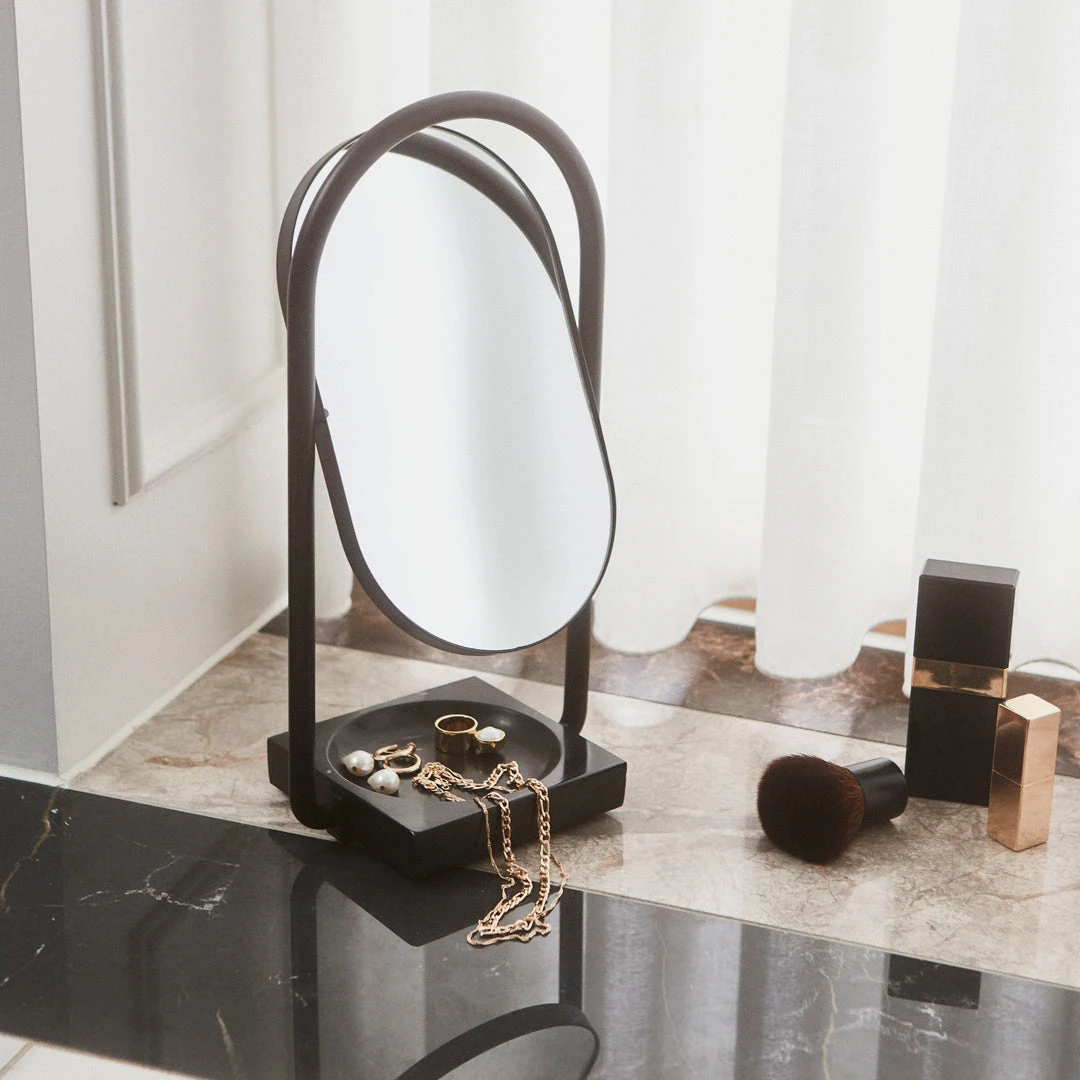 Let the soft curves of ANGUI wrap around and dominate your space. The shape of ANGUI is created to playfully experiment with the organic and graceful movements of a snake. You can effortlessly place the ANGUI table mirror on your bedroom table, bathroom stand or even as an additional reflection for your makeup vanity. The stylish and functional table mirror is two-sided and can easily be turned around to the 1:3 magnifying glass on the backside, which is the ideal reflection for putting on your everyday makeup. The bottom of the table mirror is designed with a curved socket for storage of your favorite rings and other jewelry.