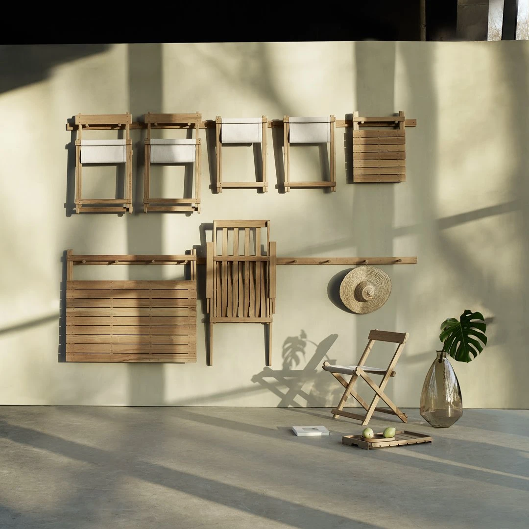 Crafted with a generous, reclining seat and a frame angled for comfort – and with the option to add a padded fabric cushion for additional support – the functional and flexible chair can easily be moved to catch the best light. When not in use, it can be folded flat and stored away or hung on a wall as a decorative feature.