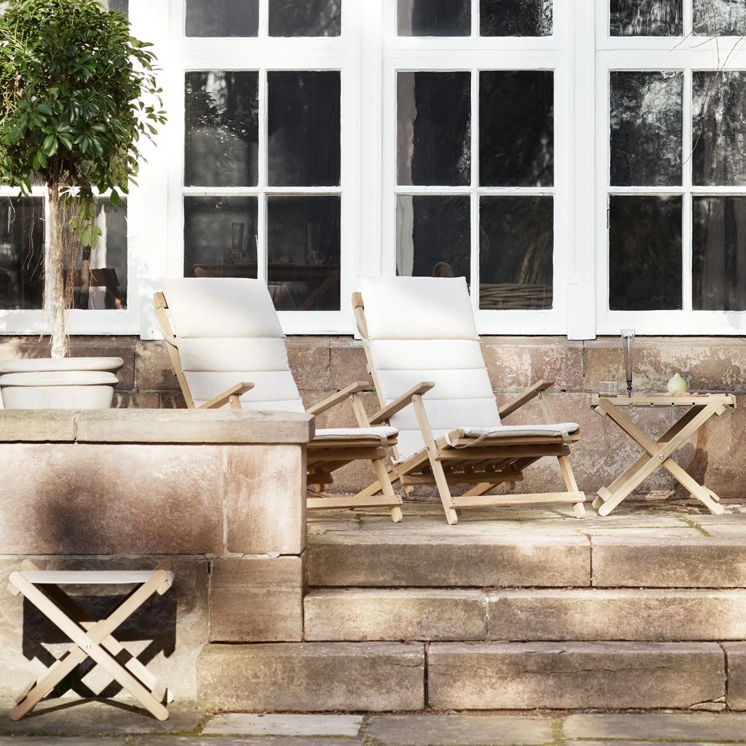 Perfectly proportioned to match the height of the series’ deck chair, the suspended seat of the foldable BM5768 Footstool is upholstered in weatherproof Sunbrella fabric, chosen for its natural look and easy cleaning. Can ideally be parred with BM1069 tray in solid Teak to create an inviting outdoor table.