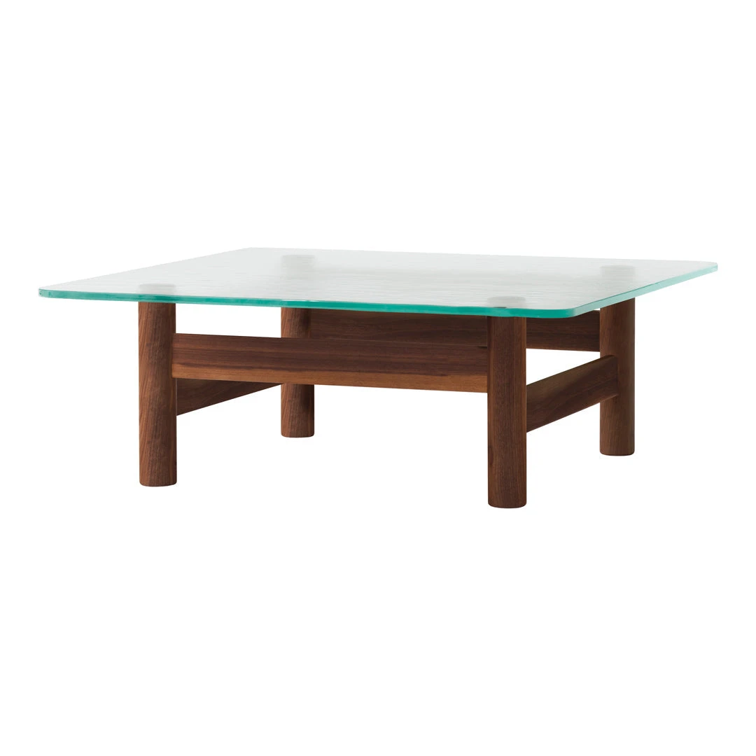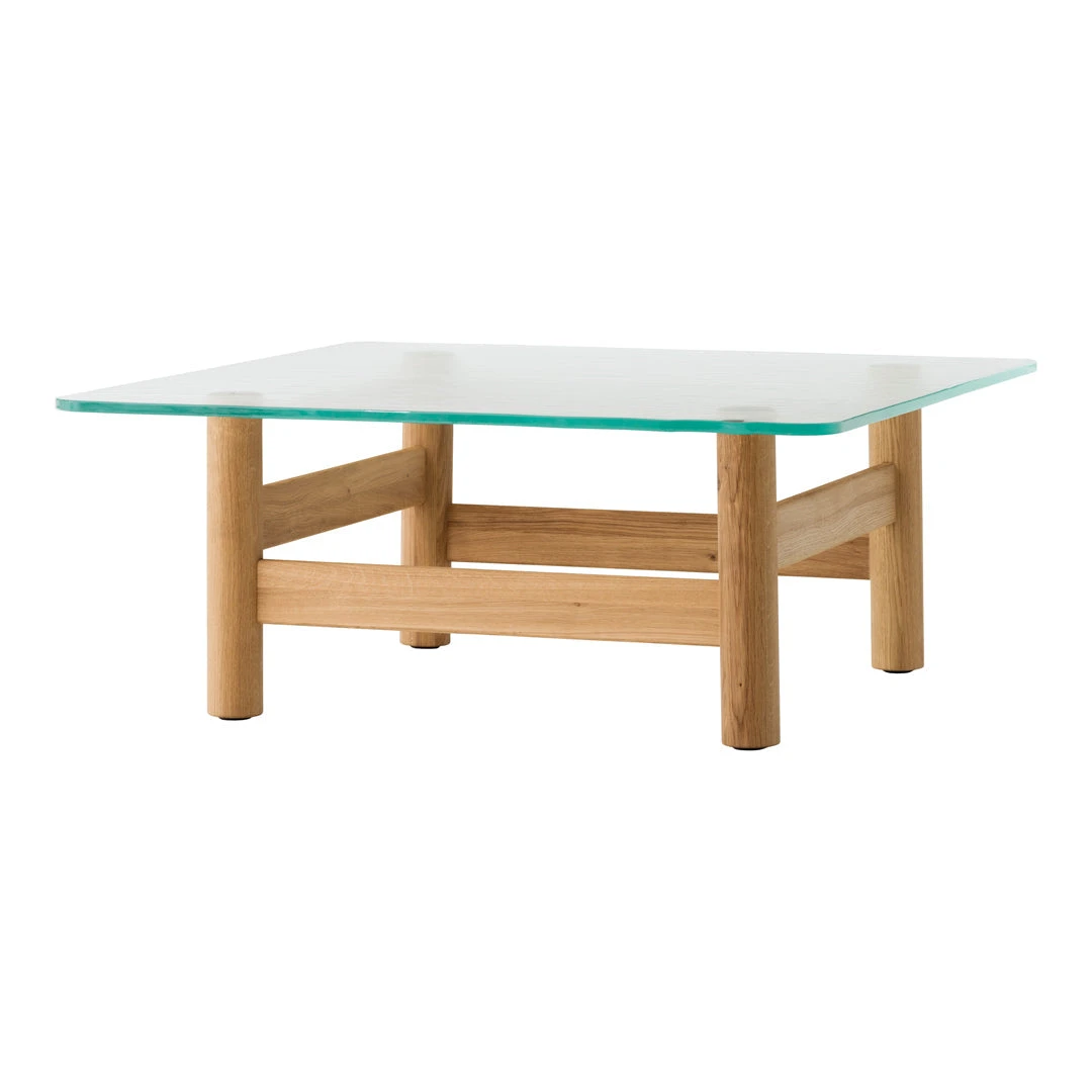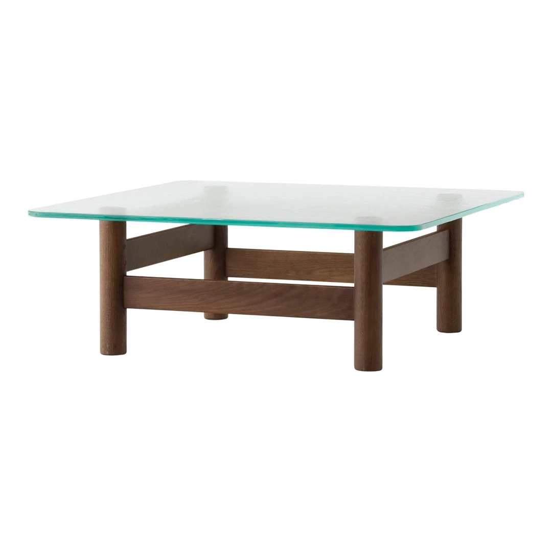 Meticulously constructed in Slovenia, the table features a precisely engineered base composed of shaped and joined wood parts that showcase traditional joinery techniques. Available in three distinctive finishes—Dark Stained Oak, Natural Oak, and Walnut—the sculptural base allows for personalization while maintaining the piece’s architectural integrity. The cylindrical legs and vertical support beams create an open framework that highlights the natural beauty of the wood grain while providing robust structural support for the 10mm thick glass top that measures a generous 39.4 inches square with a height of 14 inches.