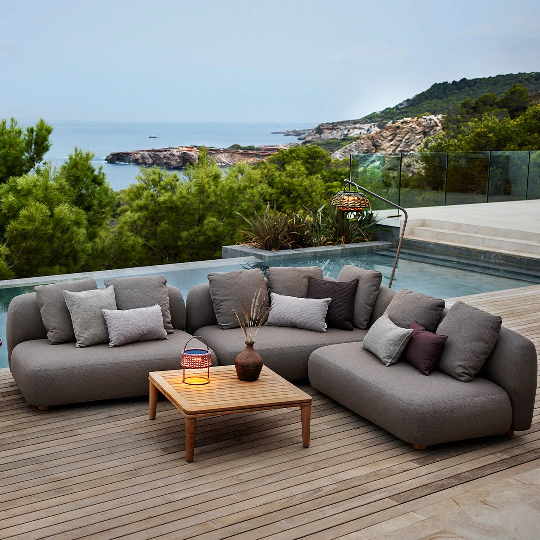 Capture is comfortable and informal lounge furniture for your outdoor space, with iconic soft shapes. A perfect balance between laid-back coziness and a modern curved design expression. Capture is a fully upholstered modular sofa, with resemblance to indoor lounges, made in durable weather resistant Cane-line AirTouch fabric. The sofa has a low seating height with an ideal depth and firm cushions made for your comfort which forms a great space for informal chats and togetherness. Let yourself get captured in the moment and just relax in a calm oasis.