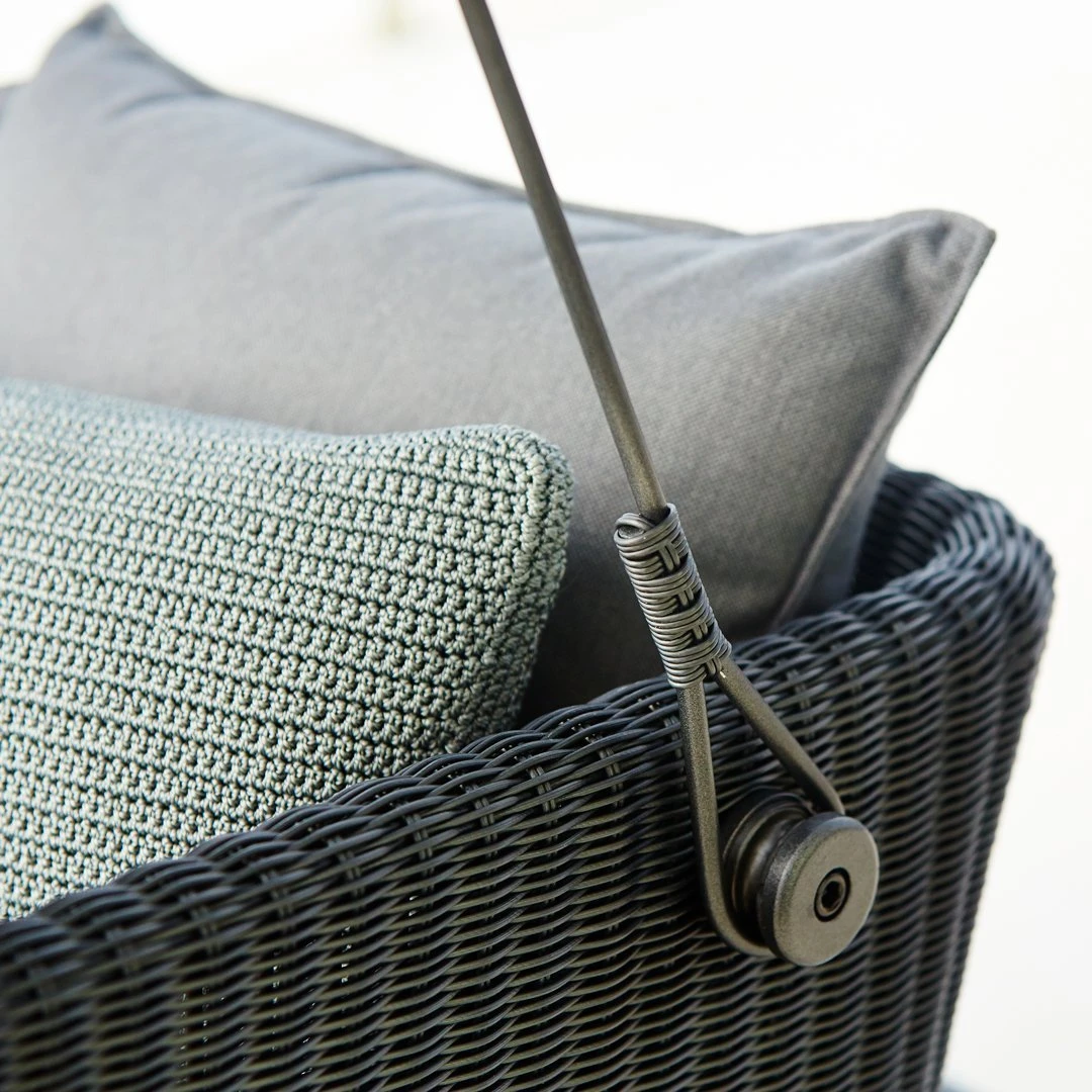 The design process has also focused on solving practical challenges, therefore the swing comes with All-weather cushions. These can be tied to the sofa with a strap specially designed for this purpose, so when the swing sofa is not in use, the cushions stay in place and dry if exposed to a rain shower. The roof and swingsofa is designed in our new “flake weaving” style with wide contemporary Cane-line fibres, that create a unique variation in the surfaces and allow for easy cleaning. Cave swing is tested to 300 kg /660 pounds under normal use. Note that Cane-line recommend that small children are kept under supervision when using the swing. The Cave swing can stay outside in you garden or terrace all year around, however, it is recommended to either mount it to a stable surface or place it in a location where strong winds are not present. This can in the worst case cause damages to the swing or the surroundings. To match with the swing sofa we recommend a white or taupe coloured On-the-move table.