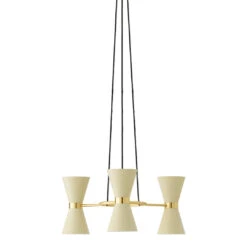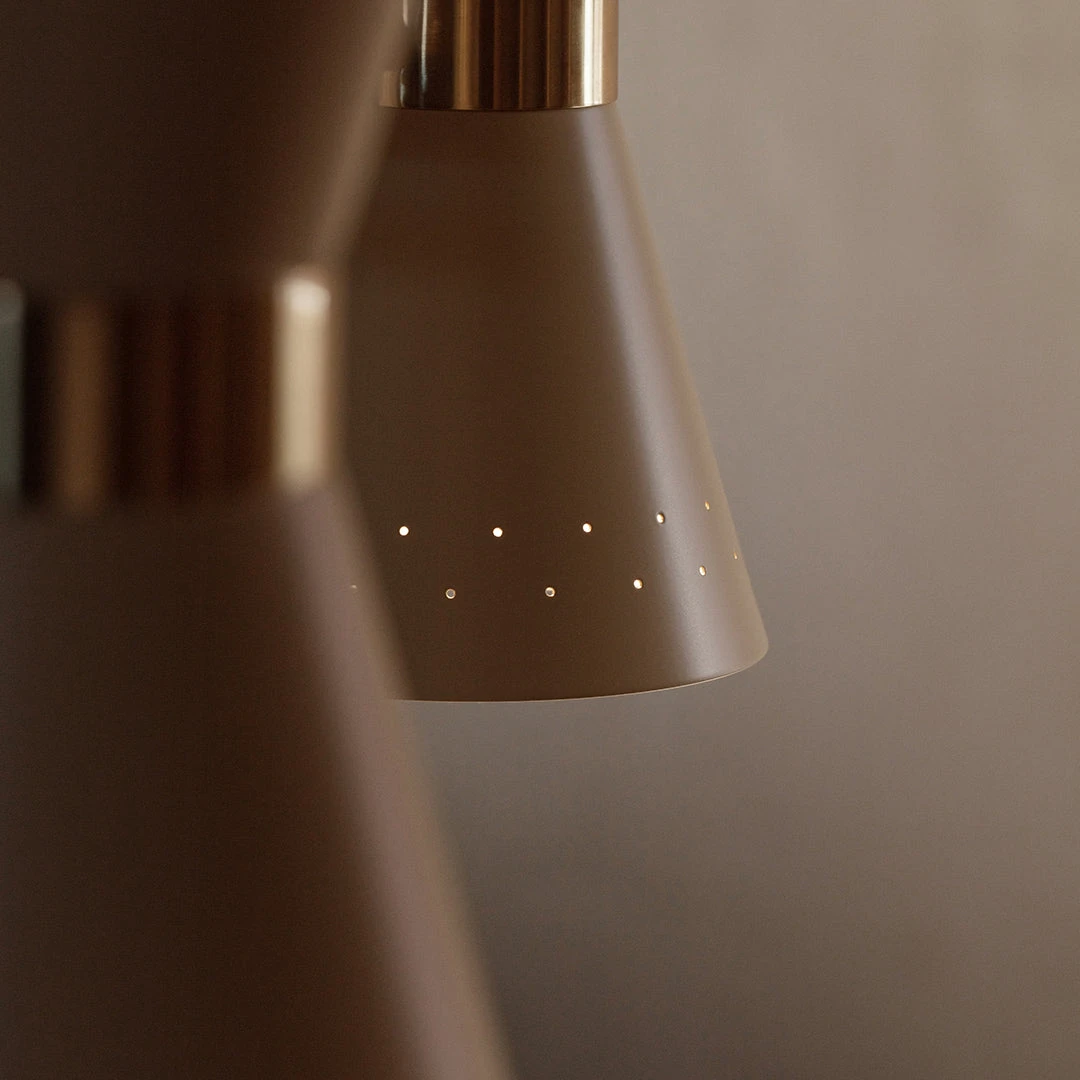 Imagined by the industrious Swedish furniture designer Alf Svensson in the 1950s, Chandelier 3 is one of three lighting designs in the Collector series. Shaped from a central band of solid brass, six conical metal shades direct the light upwards and downwards to illuminate with ambient light. Small perforations in each shade disperse the light outwards, creating intriguing shadows. The sophisticated mid-century design has timeless appeal thanks to its considered combination of graphic beauty and classic elegance. Not only functional, it is also a decorative lighting fixture in any space. One of three light fixtures created in the 1950s by Swedish designer Alf Svensson, the Chandelier 5 presents a statement-making mid-century aesthetic. Its band of solid brass holds ten geometric metal shades which direct light both upward and downward. Small perforations in the shades allow further light to shine through. Its timeless look, typical of the Scandinavian Modern period in which it was designed, lends itself to any setting, making it equally at home as an illuminating feature in a public or private space.