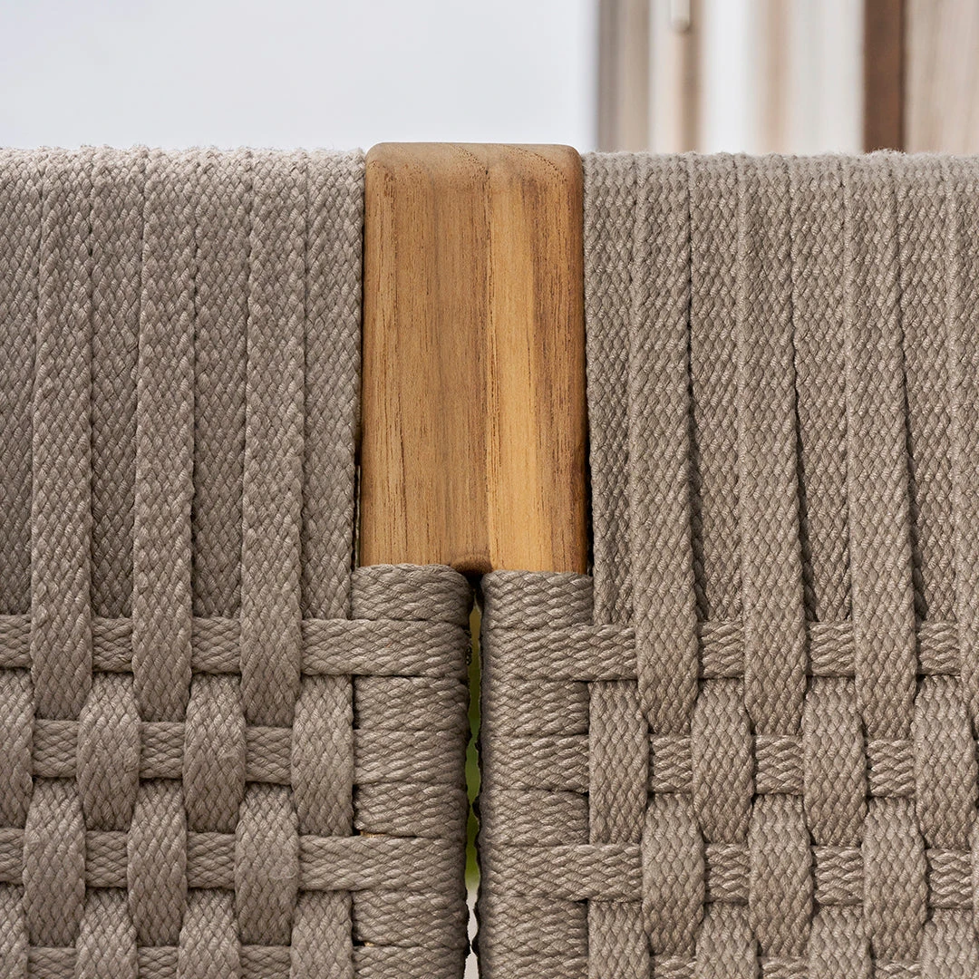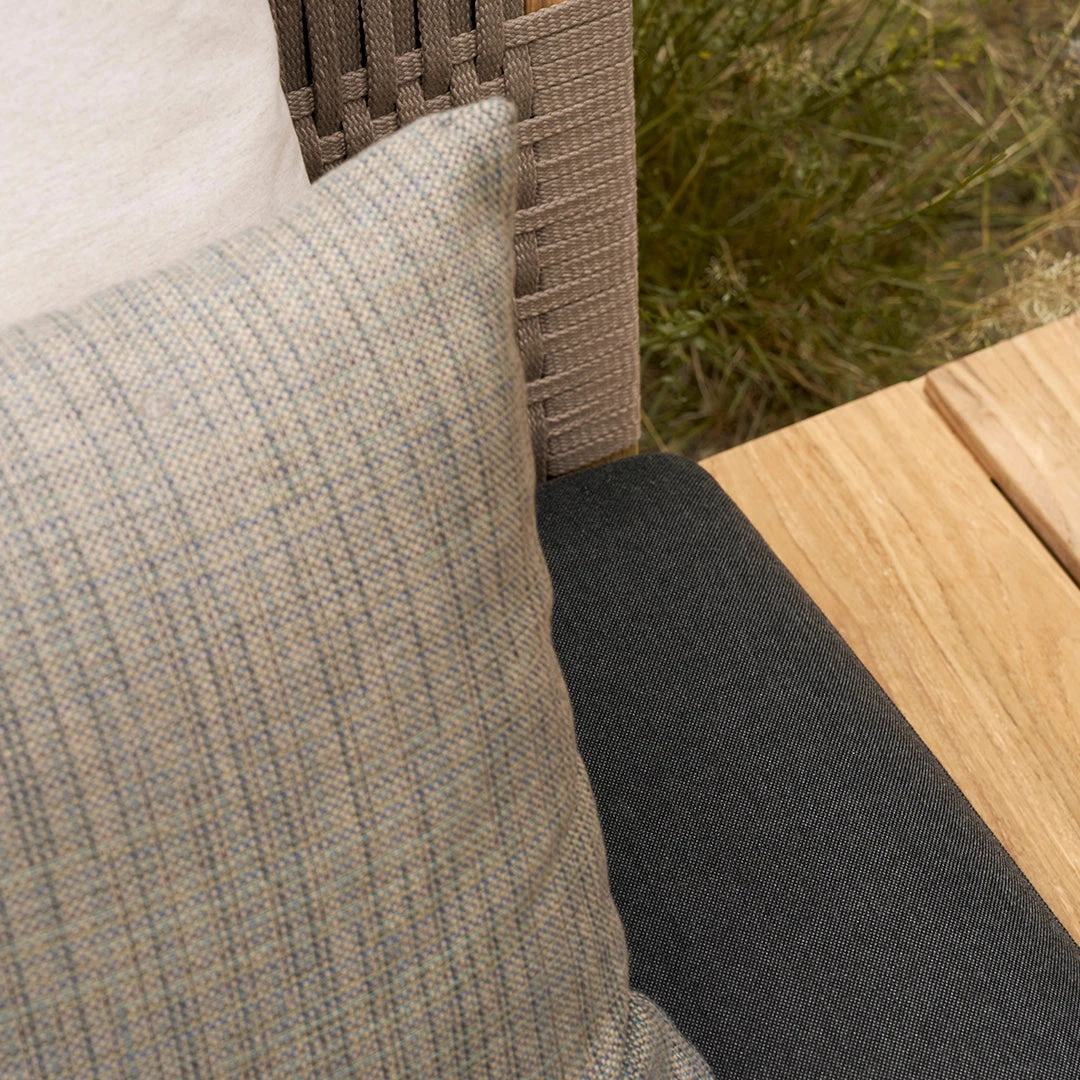 The Embrace Outdoor Lounge Sofa is a flexible, modular design featuring a solid FSC-certified untreated teak frame and soft upholstery. A hand woven flat rope back and armrests support soft upholstery in a range of earthy colors.