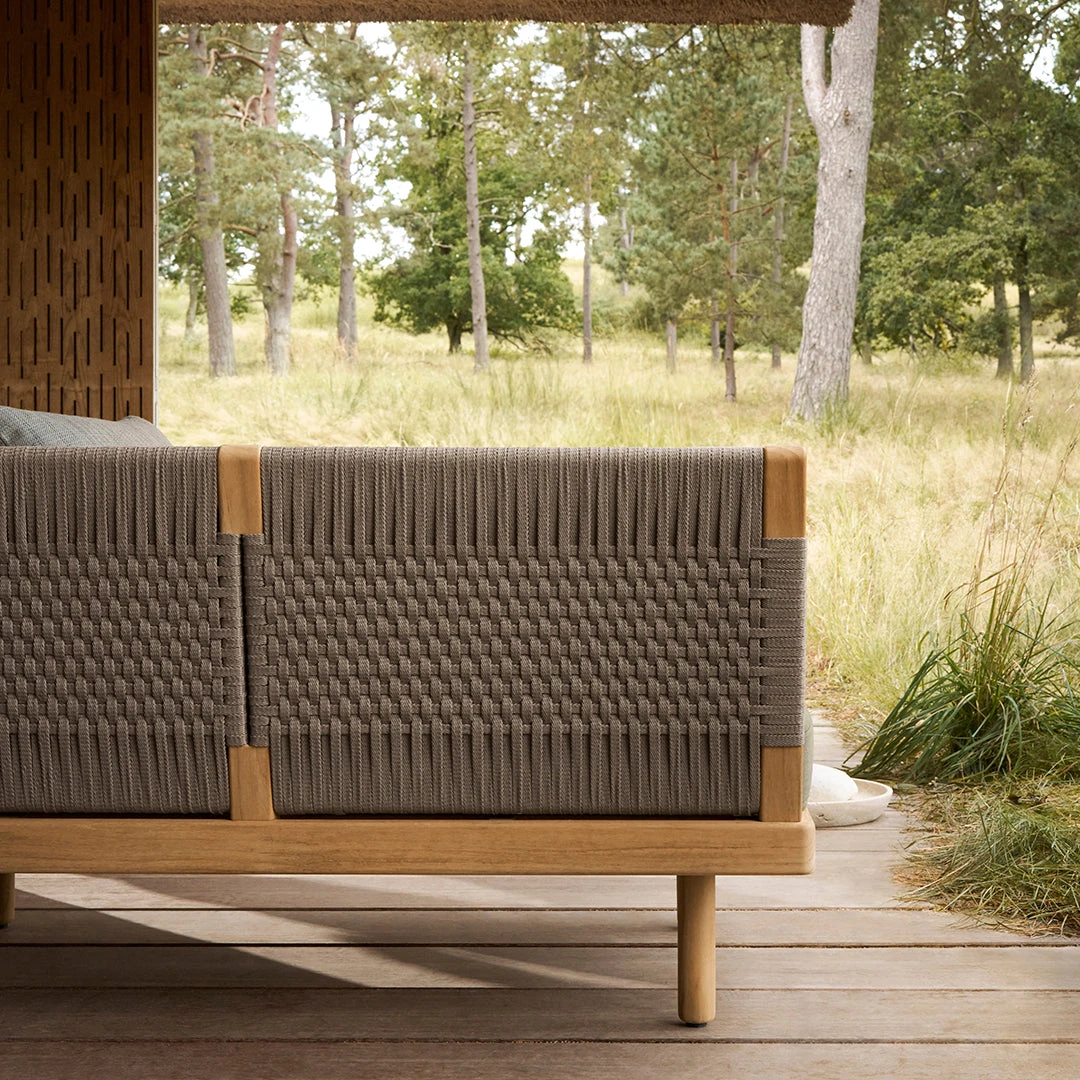 The Embrace Outdoor Lounge Sofa is a flexible, modular design featuring a solid FSC-certified untreated teak frame and soft upholstery. A hand woven flat rope back and armrests support soft upholstery in a range of earthy colors.