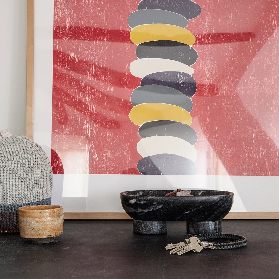 Challenging the expression of a classic bowl, the Alza Bowl has an elevated design with its tray based on a sturdy plateau. Both light and grounded, this design unites contrasts and lets them come together in a beautiful black marble bowl.