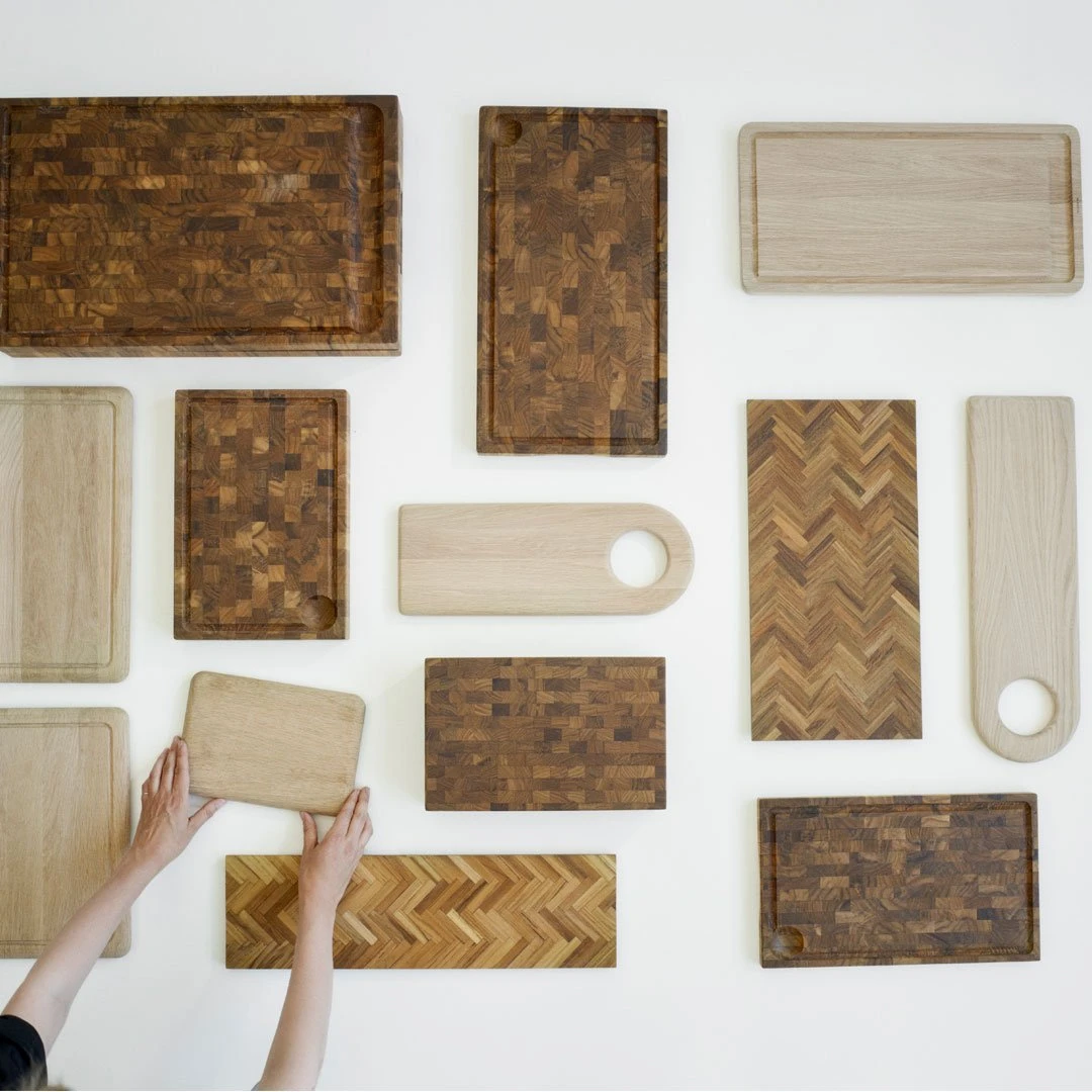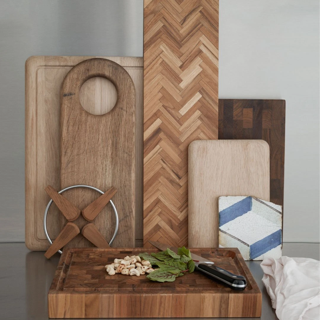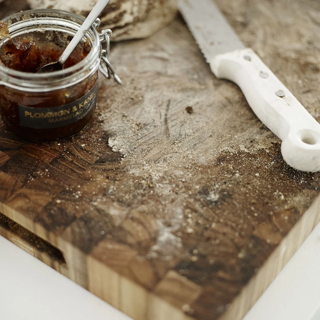 Your knife’s new best friend. Assembled by small pieces of teak end grain, each cutting board gets a unique pattern in various light and dark brown nuances. Teak contains natural oils resistant to moisture and germs and the upward fibers on end grain absorb the impact from knife blades sublimely. This ensures a top-notch durability – both in terms of the board itself and the knives used on it. Larger sizes have built-in grips on each end and a juice groove that collects liquids and crumbles before the cause any troubles.