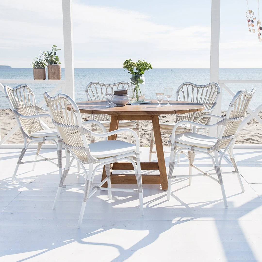 The George Teak Round Table is made of recycled teak from old fishing boats and houses. Reparations and fillings add to its unique charm. Add a set of Marie side or arm chairs for a beautiful and practical outdoor dining space.