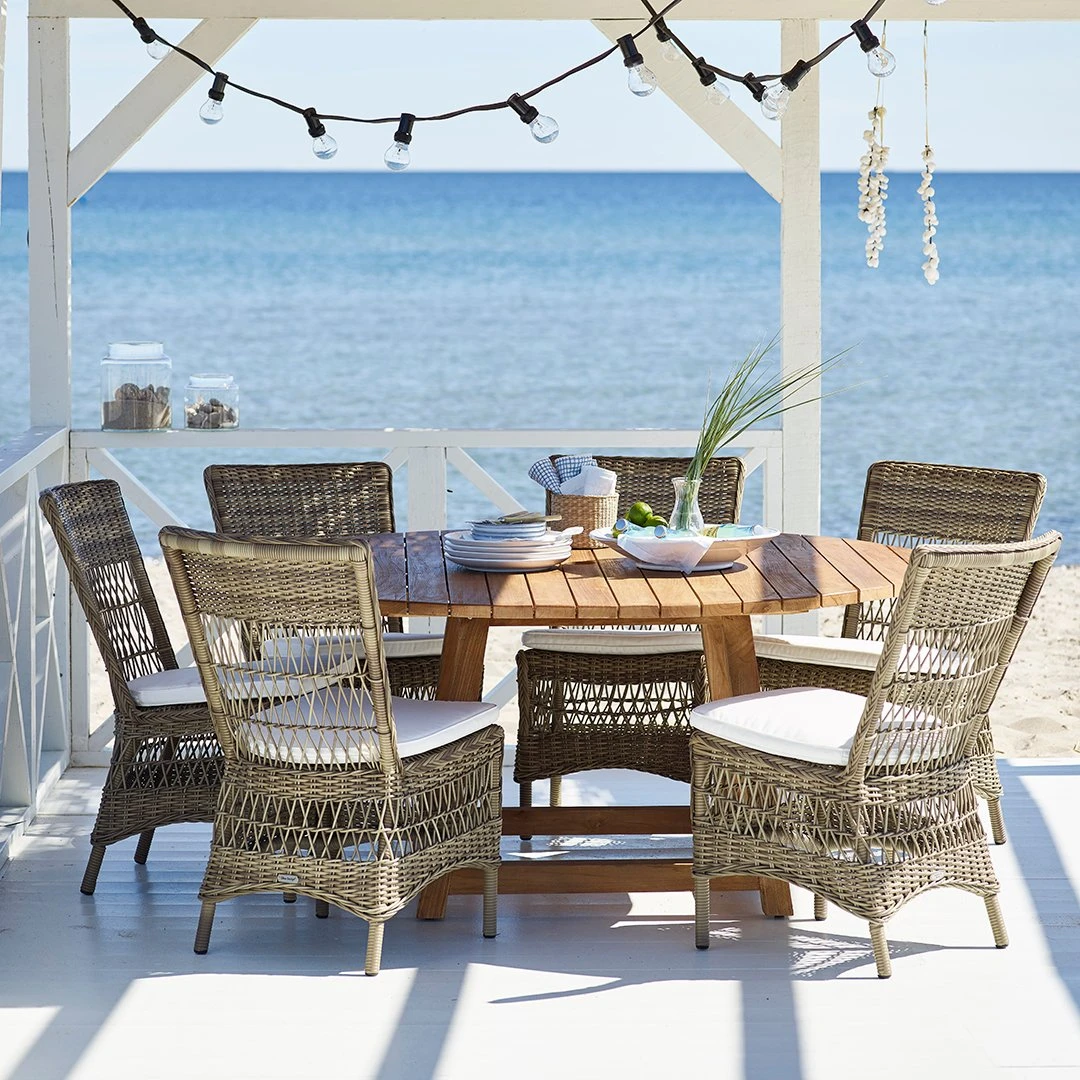 The George Teak Table is made of recycled teak from old fishing boats and houses. Reparations and fillings add to its unique charm. This piece pairs perfectly with two George teak benches or six Marie chairs.