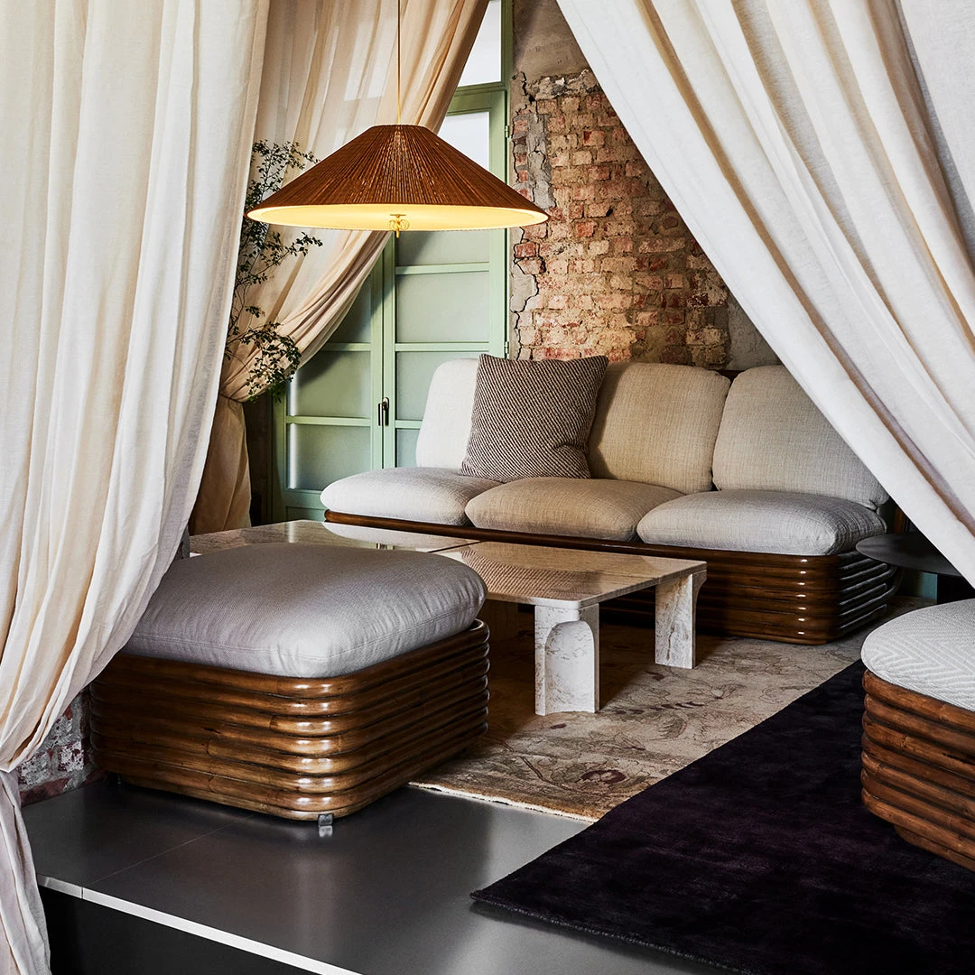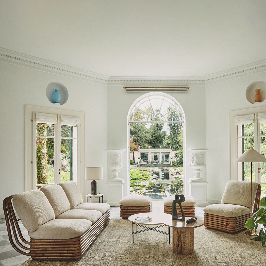 Comprising a lounge chair, three-seater sofa, ottoman and floor lamp – all crafted from rattan – the Bohemian 72 Collection embodies Crespi’s career-long aim to create furniture that seamlessly unites indoor and outdoor living. She never allowed curtains or screens to block the natural flow of light or air and had what her daughter has described as ‘a deep sentiment for the cosmic energy of nature.’ Suitable for indoor or outdoor use but in a covered area where the ottoman will not get wet.
