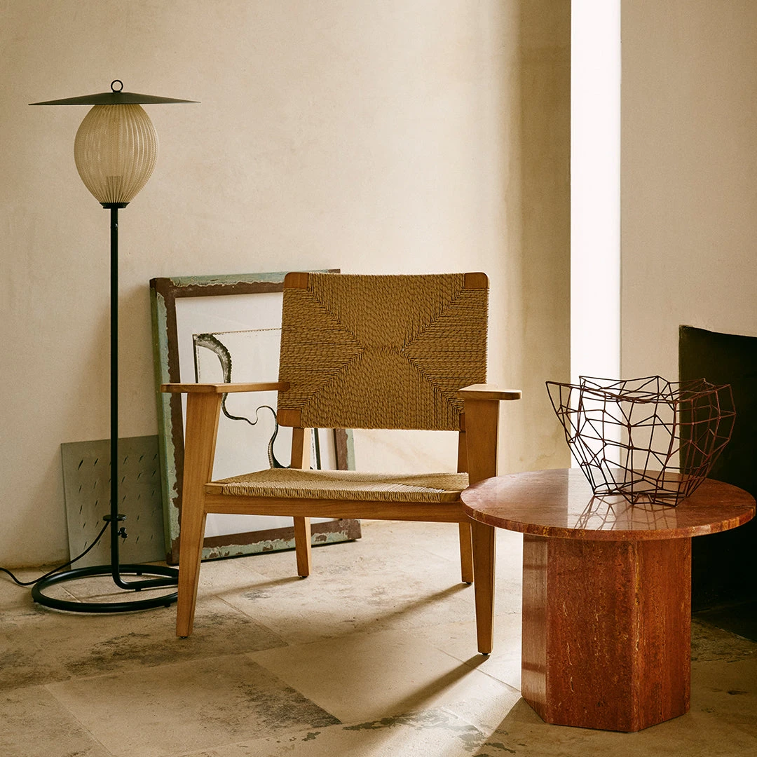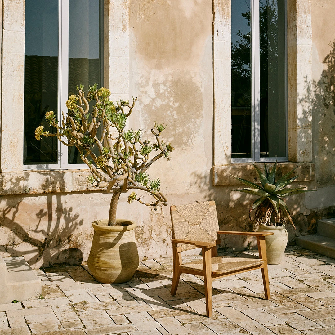 An archetypal lounge chair, the F-Chair evolved out of the C-Chair and shares the same tapered rear legs, though the F-Chair features upright front legs. The more relaxed incline and paddle-shaped armrests, together with its woven seat which widens at the front, make the F-Chair an altogether more leisurely affair.