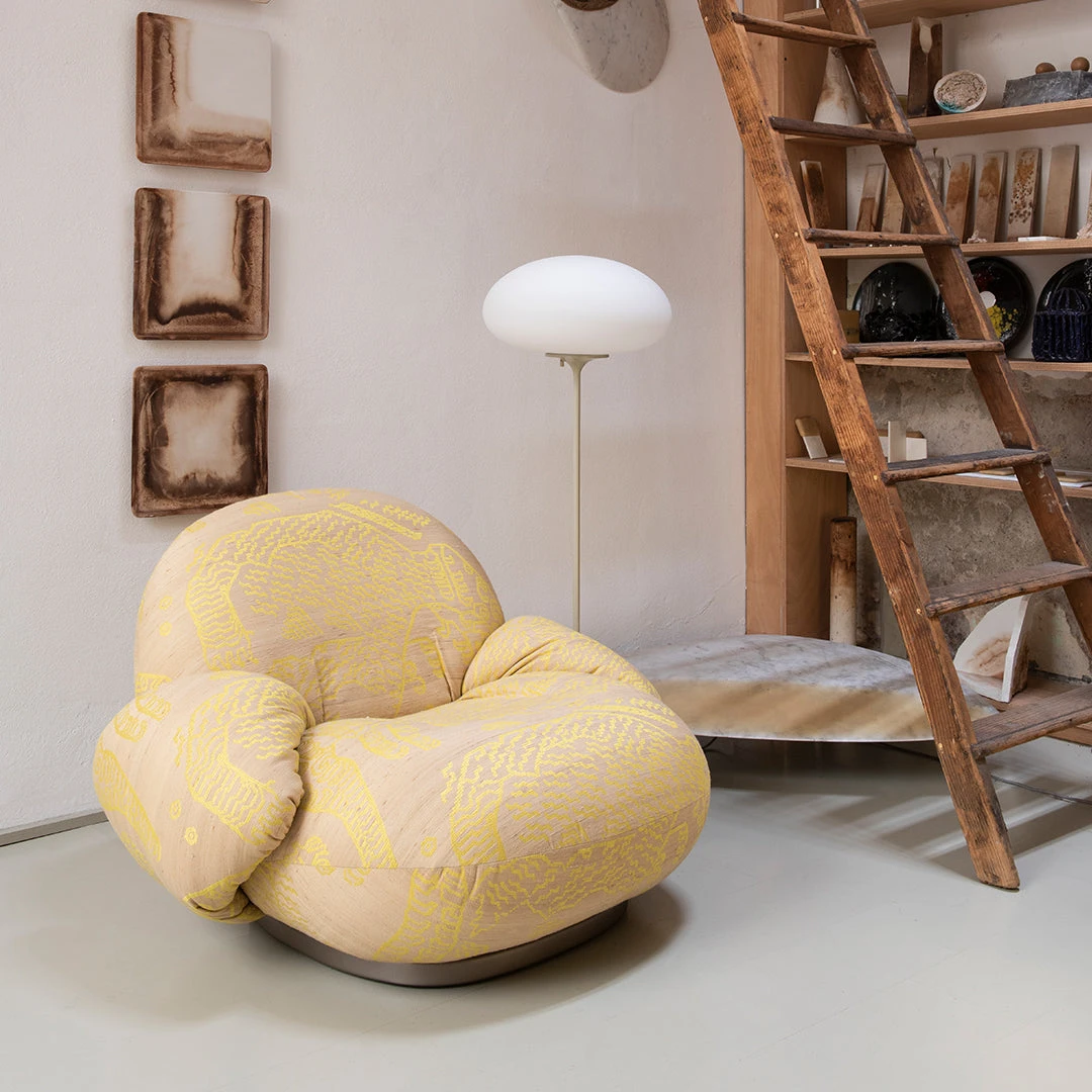 Part of GUBI’s thoughtfully reissued Pacha Collection, this armrest version can be customized in an extensive array of fabrics and materials. The distinctive silhouette confidently carries bold colors and tactile expressions, allowing for personalization while maintaining the design’s iconic character. When upholstered in premium materials like velvet or leather, the chair develops intentional wrinkles along its curved seams—a characteristic that adds to its sensual, lived-in appeal.