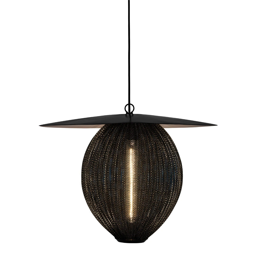 The Satellite Pendant of two sizes is designed by Mathieu Matégot in 1953 with geometrical shapes and an organic shade to create outstanding sculptural aesthetics.