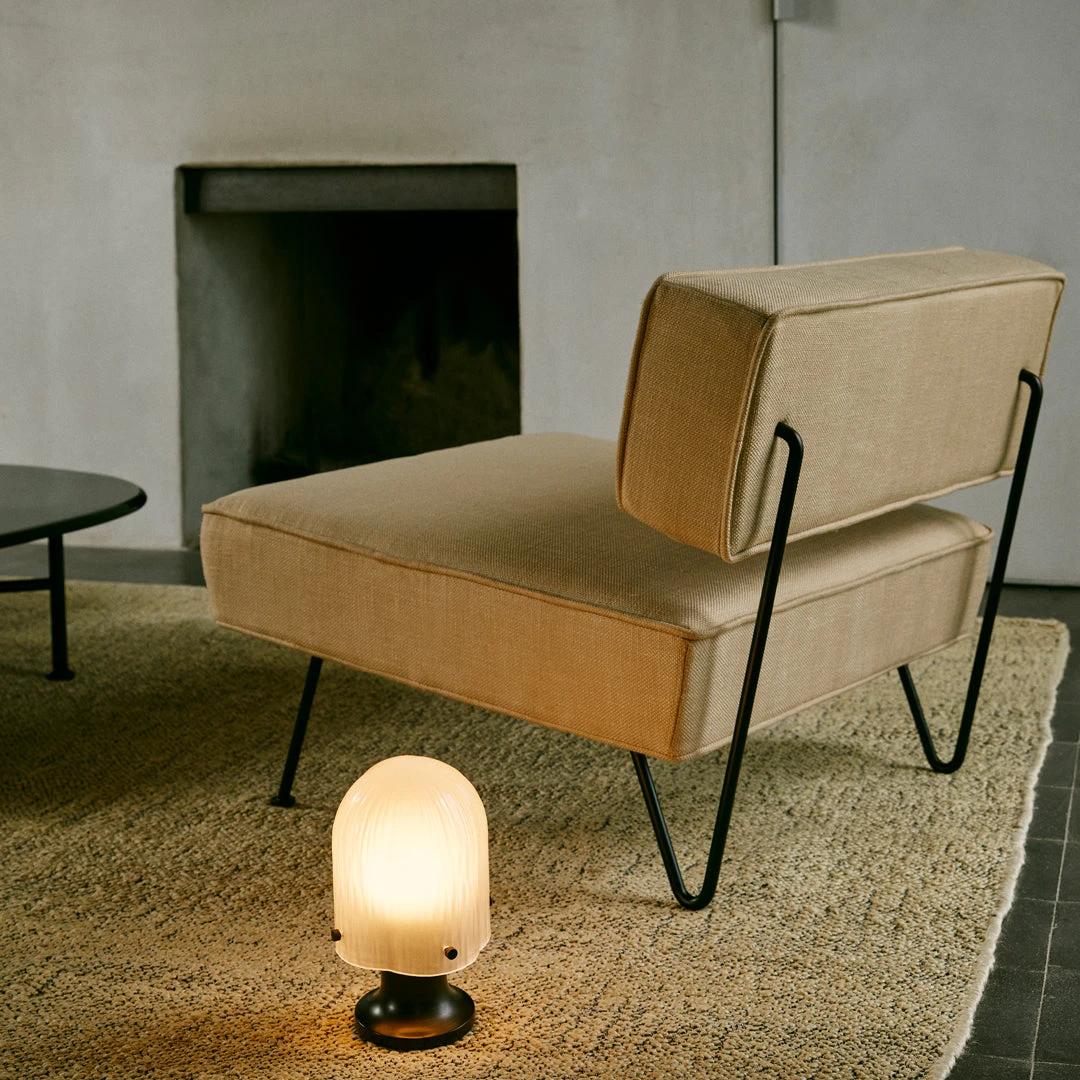 The portable version of Space Copenhagen’s Seine Table Lamp brings the design’s magical and atmospheric play of light to both indoor and outdoor spaces. Inspired by the behavior of light and water, it features a mouth-blown sandblasted glass shade with a sandblasted finish.