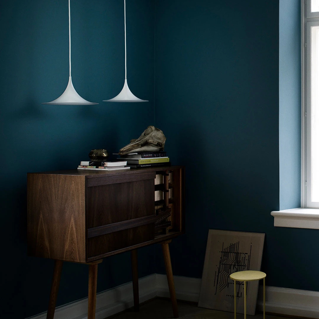 The Semi Pendant is a unique pendant lamp, based on two quarter-circles put together, back-to-back. It’s distinctive arch-shaped, enamelled metal shade creates a diffused, cone-shaped light, ideal over a dining table or kitchen work surface. With its lightness of form, unique timeless design and range of colours and sizes, the Semi Pendant is extremely versatile and well suited to both private and public spaces.