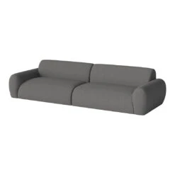 The Hippo Chair rest on two sturdy wooden legs, seamlessly connecting the seat and back. The distinctive wooden profile acts as an almost architectural element that starkly contrasts with the rounded, soft back and seat.