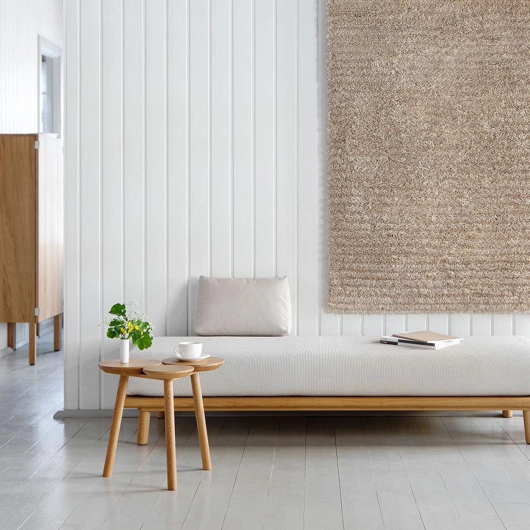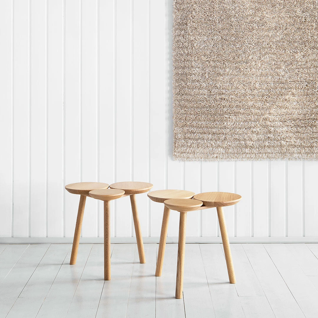 “July is a wooden stool inspired by the intrinsic beauty of imperfection. Like a bundle of wooden logs, three individual ‘slices’ ‚Äî unequal in size, variegated in grain and color, and uneven surface angles ‚Äî unite to create a beautiful, singular form. Each stool enjoys its own sense of individuality. Together, in multiples, they create a sculptural seating display for gathering spaces.” – Nao Tamura
