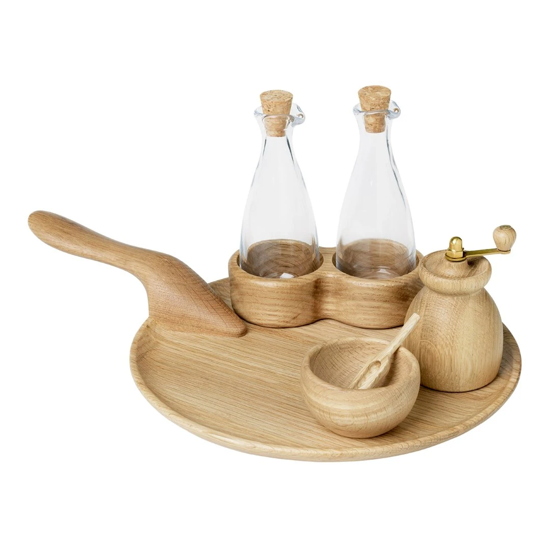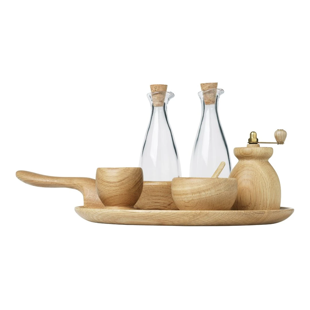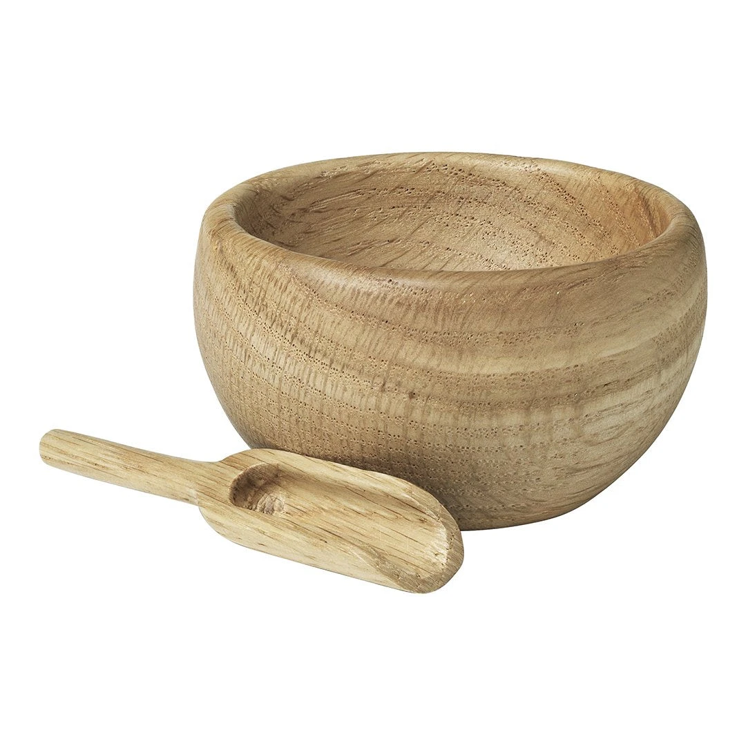 Elegantly crafted salt cellar and spoon from Kay Bojesen’s Menageri range. The salt cellar measures 7 cm in diameter and stands 4 cm tall. It is turned and made of oak, so you can admire the beautiful grain, which gives it a unique handsome appearance. The wood has a food grade finish, so it is less susceptible to food stains. The inspiration for the salt cellar comes from household products designed by Kay Bojesen back in the 1940s, when he crafted beautiful, useful wooden items.
