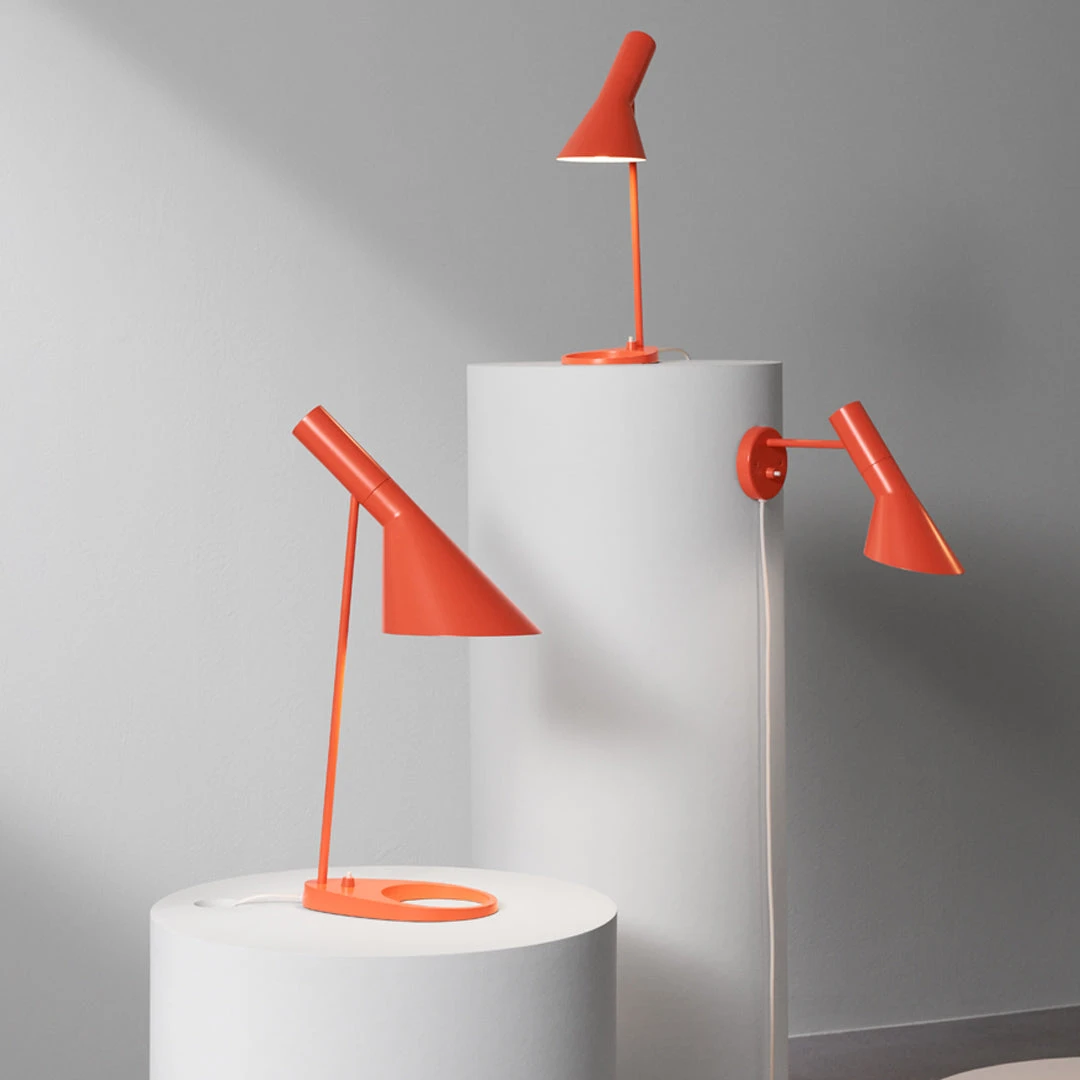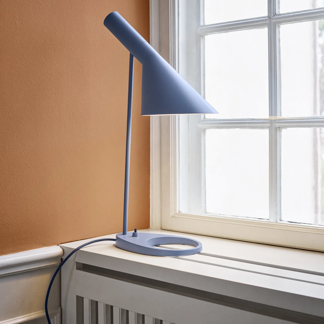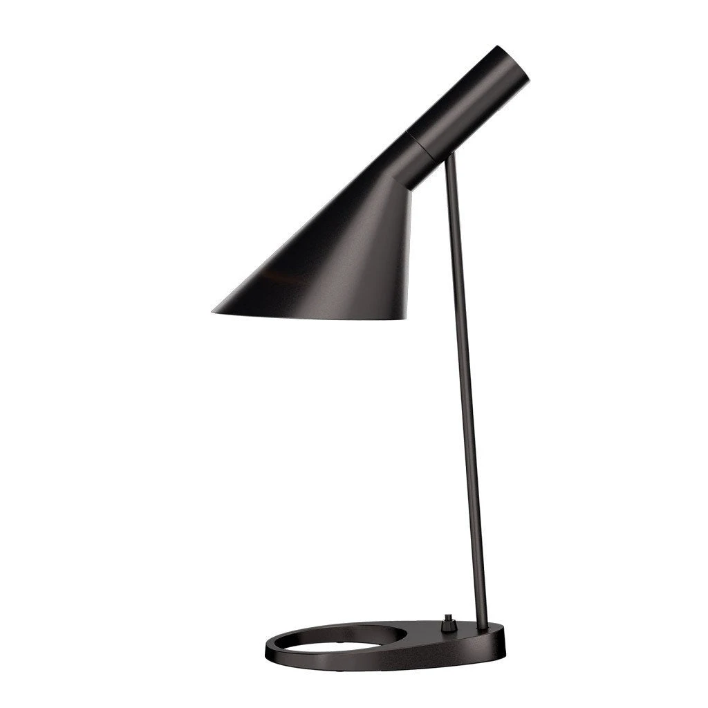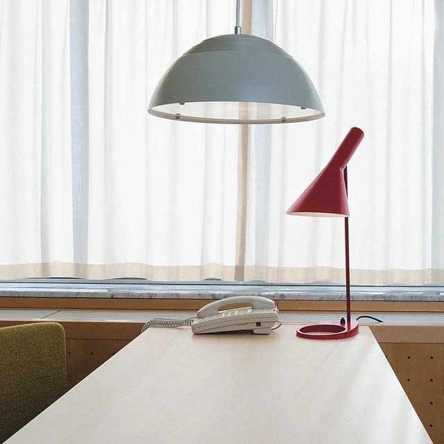 The AJ table lamp was designed, among other lighting fixtures, for the SAS Royal Hotel in Copenhagen. The AJ table lamp is on the same principles as the AJ floor, but due to the useability as a working desk lamp the shade has been expanded. The base of the table lamp was originally intended to accommodate an ashtray but now contributes solely to the design.