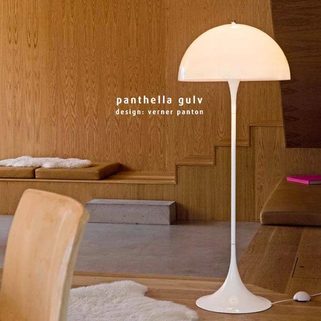 Created in 1971, Verner Panton’s Panthella is one of his more popular designs. The basic light principle aimed to create a lamp in which the base as well as the shade would act as a reflector. The lamps light source is hidden under a milky-white, hemispheric acrylic shade and a white, trumpet-like base contributes to a beautiful distribution of light and a well balanced form.