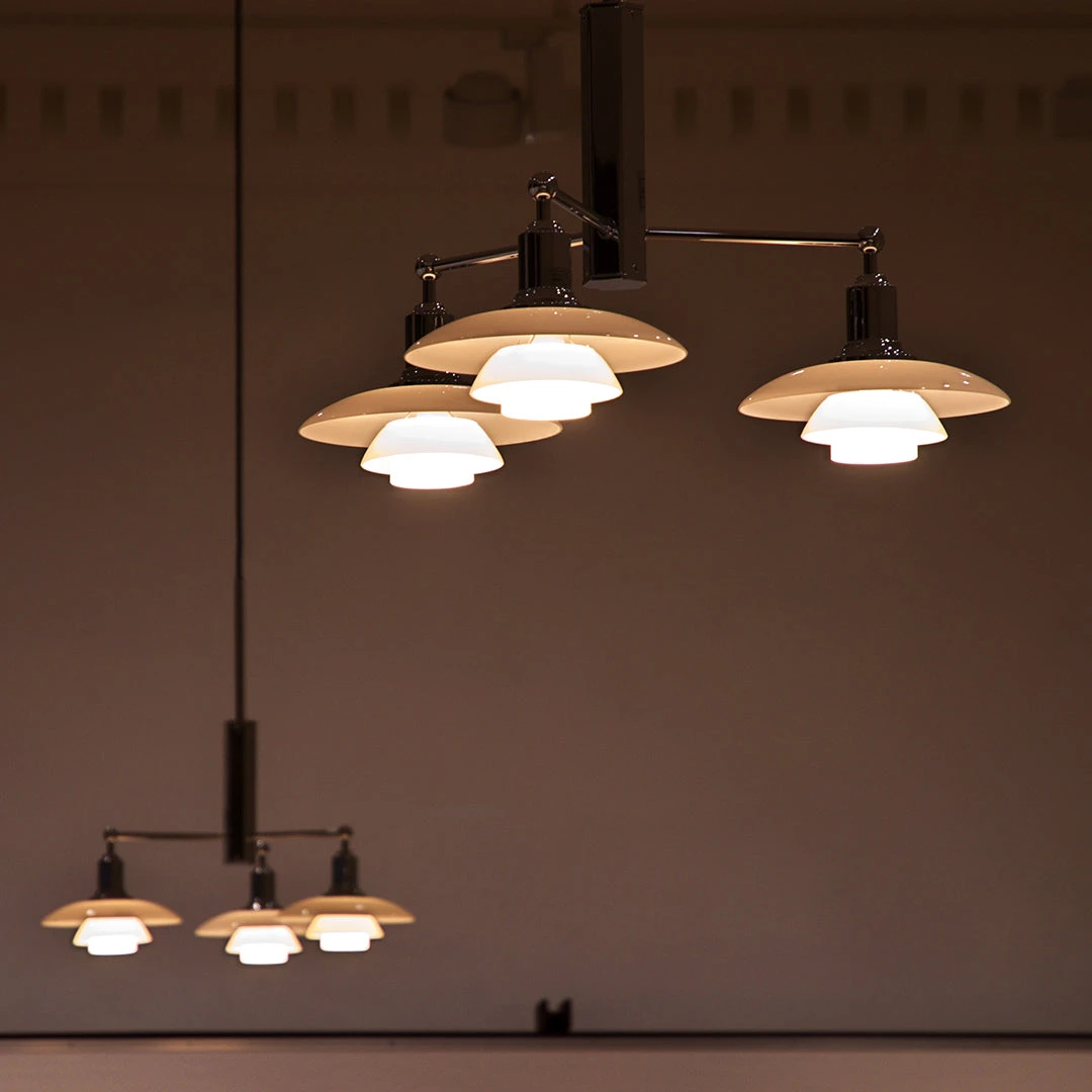 The fixture is designed based on the principle of a reflective three-shade system, which directs the majority of the light downwards. The shades are made of mouth-blown opal three-layer glass, which is glossy on the top and sandblasted matt on the underside, giving a soft and diffused light distribution.
