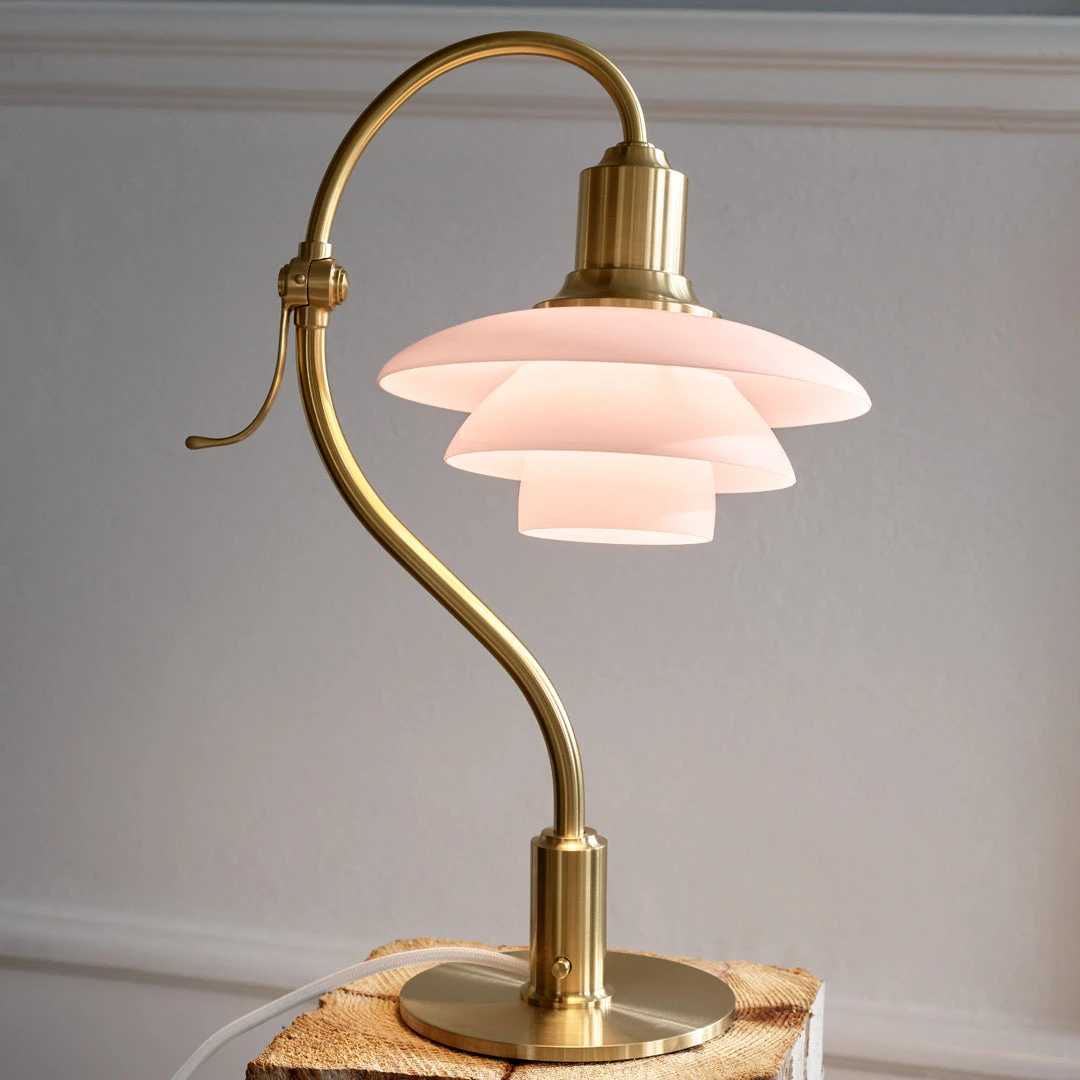 Originally introduced in 1939, the PH Luna was known as ‘The Night Stand Lamp’, a name given to the petite table lamp by its designer, Poul Henningsen. The characteristic curved form of the stem makes the PH Luna recognizable and the brushed brass finish is a soft and classic complement to the opal glass shades. Originally, PH Luna was just 230 mm tall, however in this new limited edition, this has been increased to suit the possible applications. The head of the lamp can be adjusted by rotating it to suit your lighting needs.