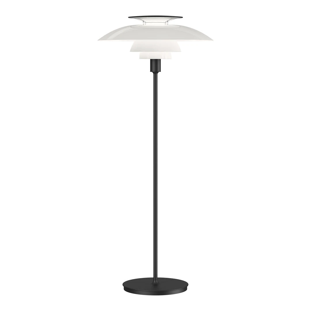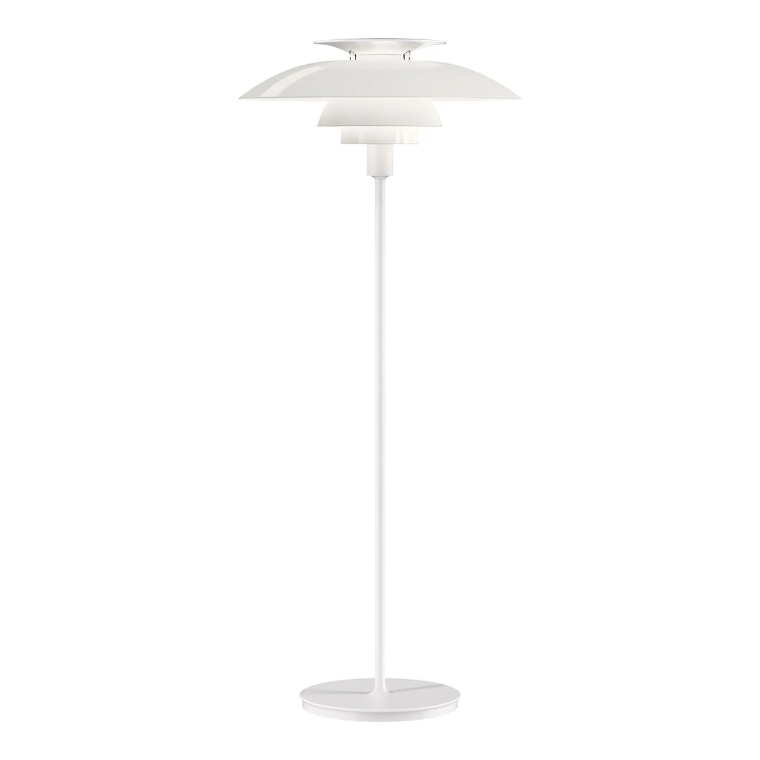 The fixture emits diffused and symmetrical light. The majority of the light is directed downwards, and the opal acrylic shades provide comfortable room lighting. The red hue of the top reflector helps giving the light a warmer glow.