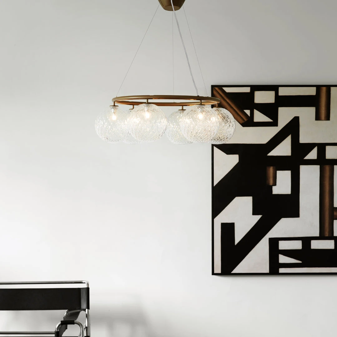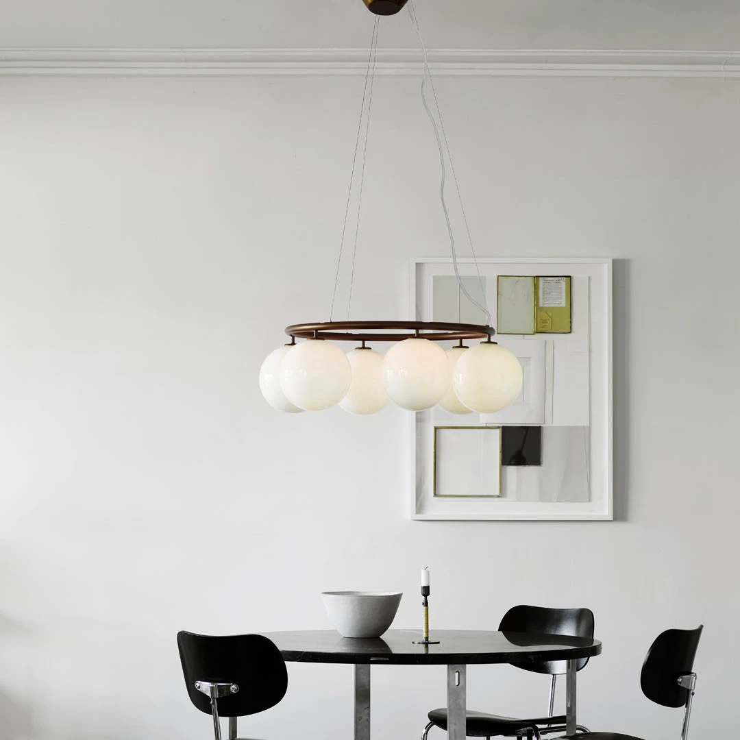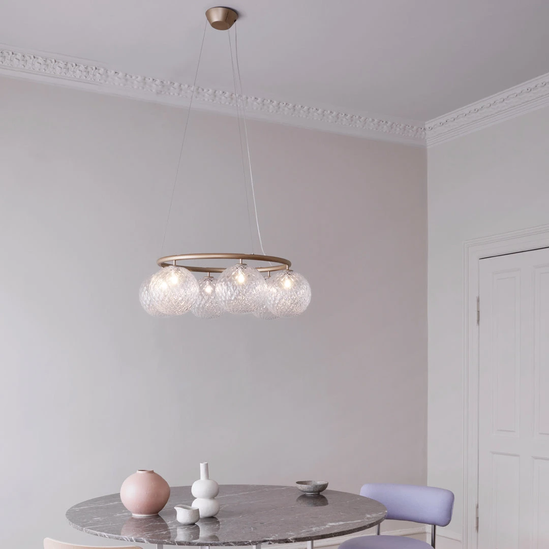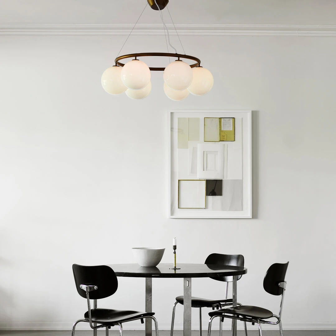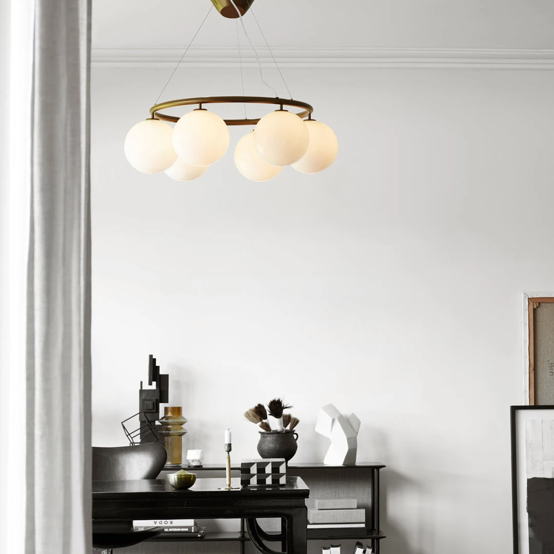 Miira 6 Circular is a modern chandelier in an organic, circular design and contrasting yet complementing materials. The chandelier comprises a wet painted metal ring and 6 mouth-blown glass globes from which a sensuous light is spread. Ideal above a dining table or sofa.