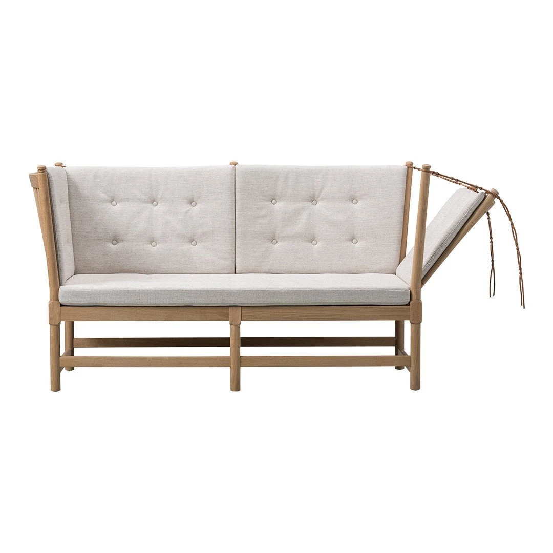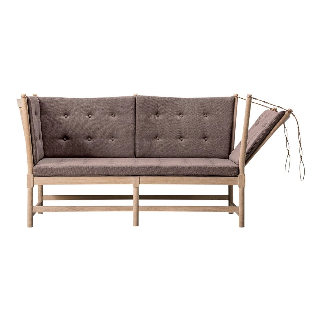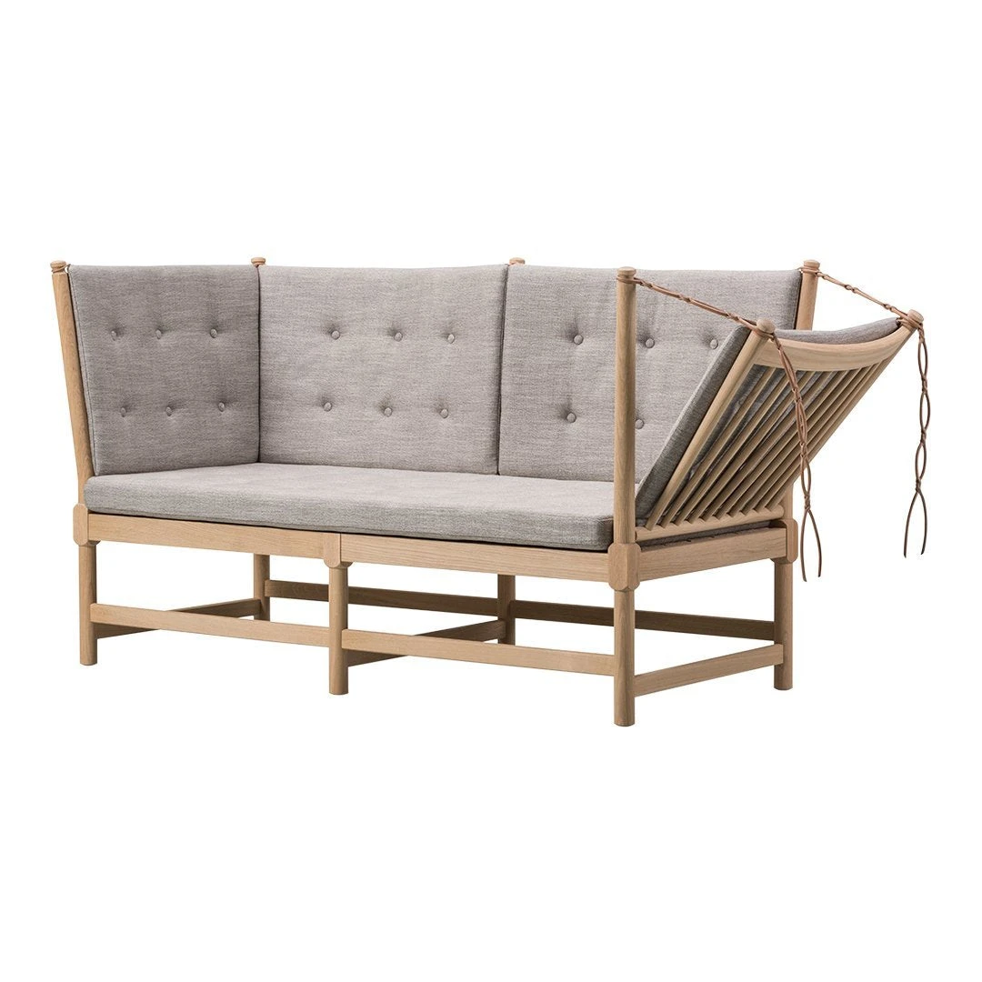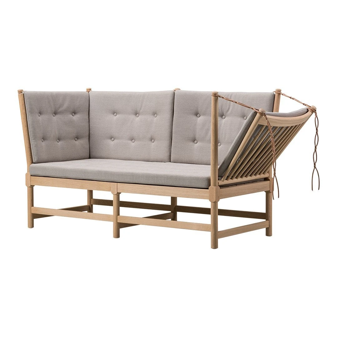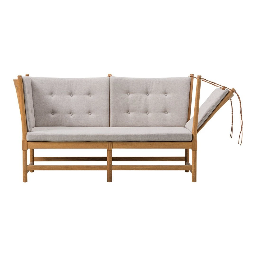 The Mogensen Spoke-back Sofa designed by Borge Mogensen in 1945 as a daybed and chaise lounge hybrid, with a hinged side. The exposed construction was too sophisticated for modest post-war culture and the sofa did not go into production until 1962.