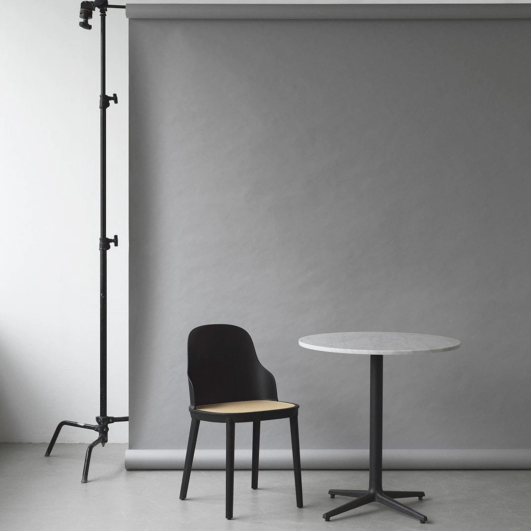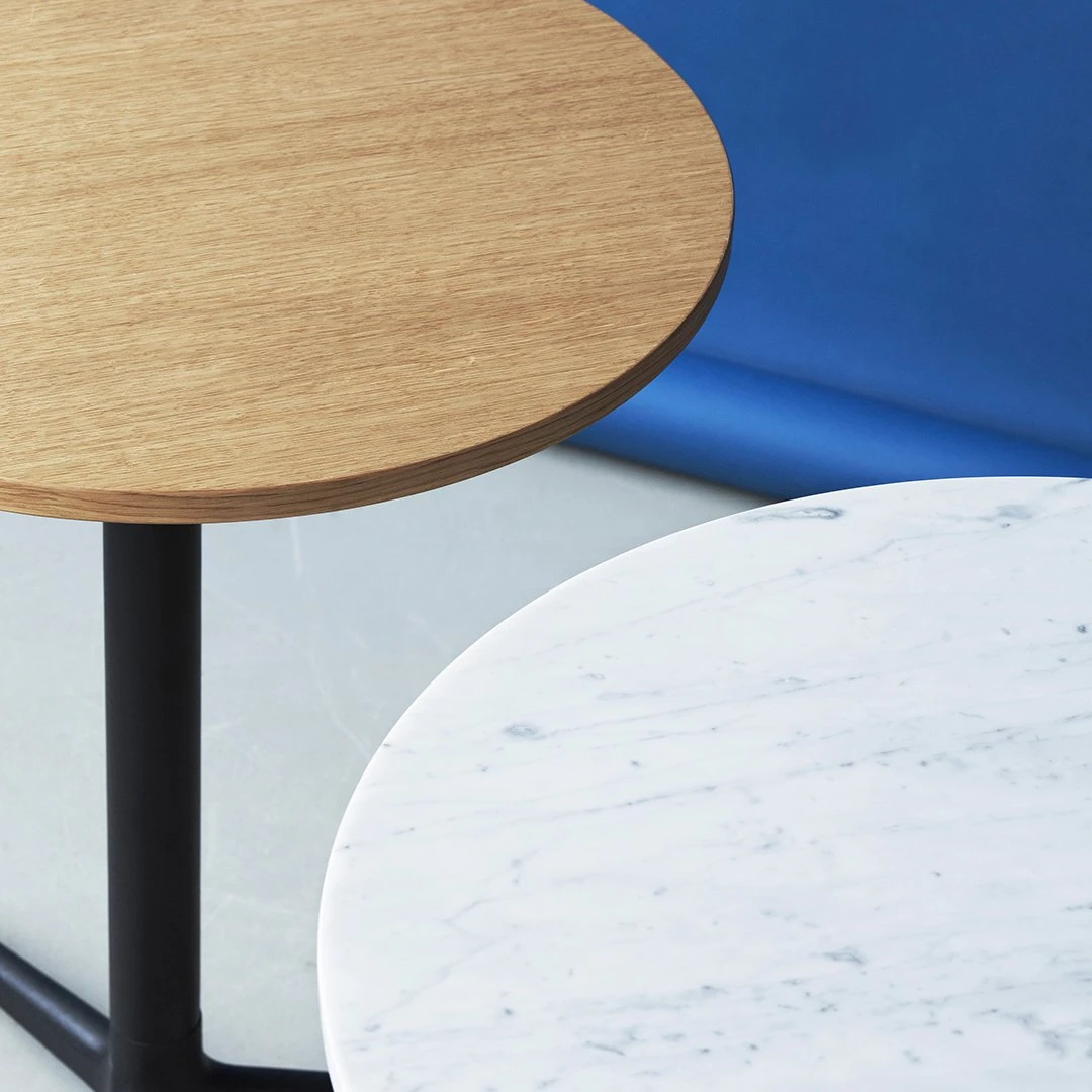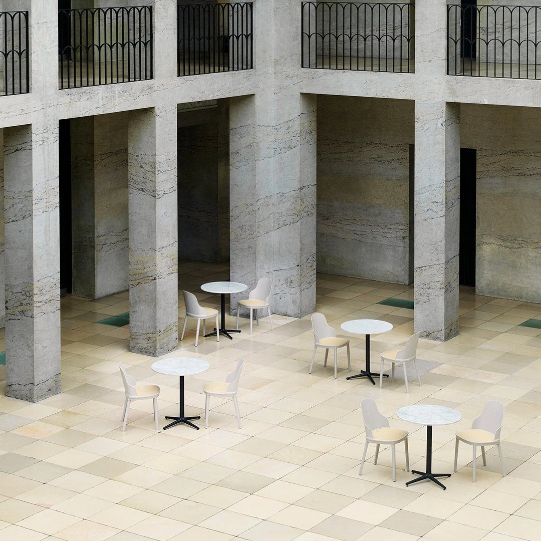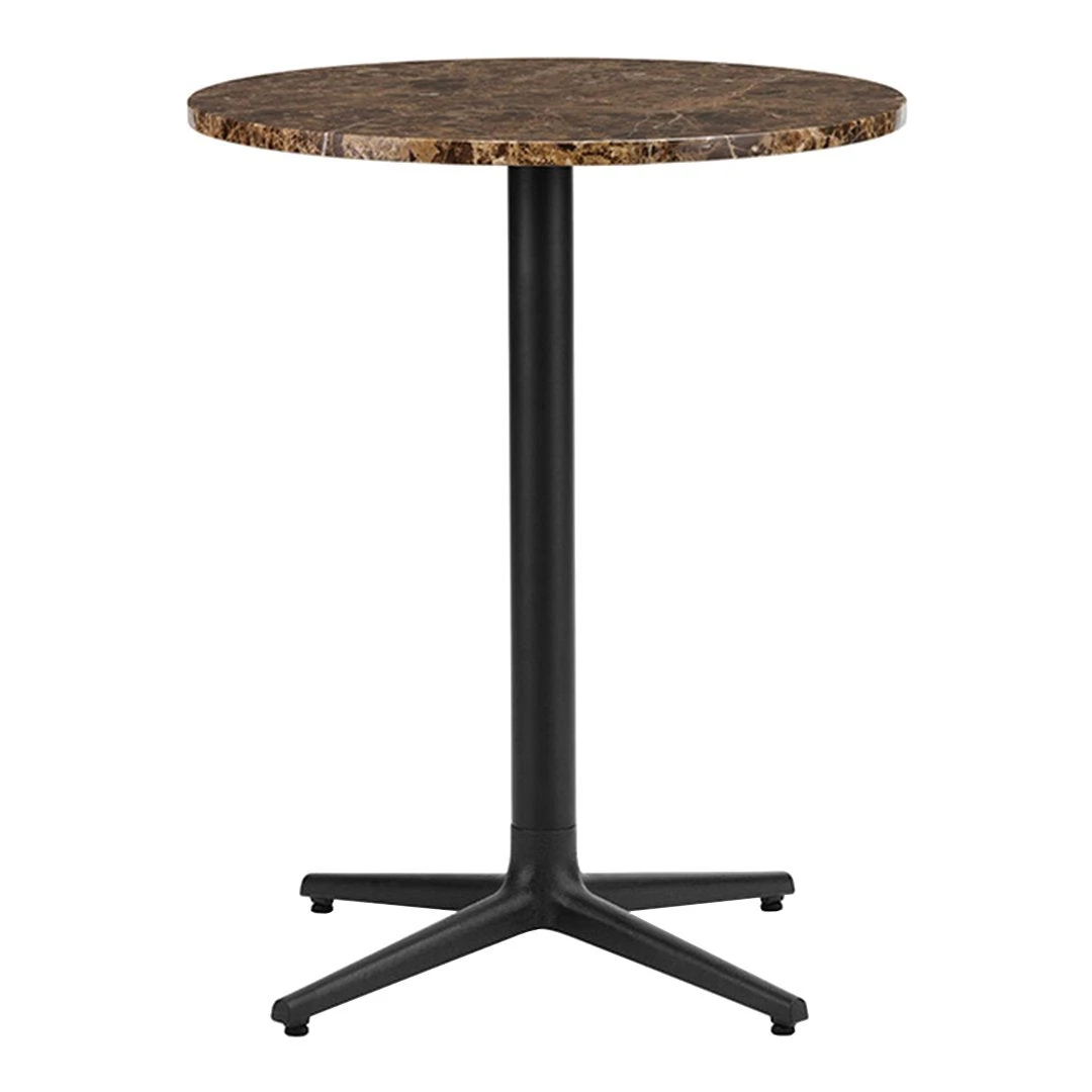Allez table consist of a center base in cast iron with three or four legs. The tabletop comes in various sizes and shapes available in marble, Veneer, or brushed stainless steel. Allez table is suitable for indoor or outdoor use. The table is delivered flat-packed and must be assembled using the included tools. The tabletop is mounted with four screws.The marble tabletops are treated with a surface treatment that penetrates into the material and thereby provides a long-term protection. The surface should not be exposed to acidic foods or beverages, which can leave stains on the surface.