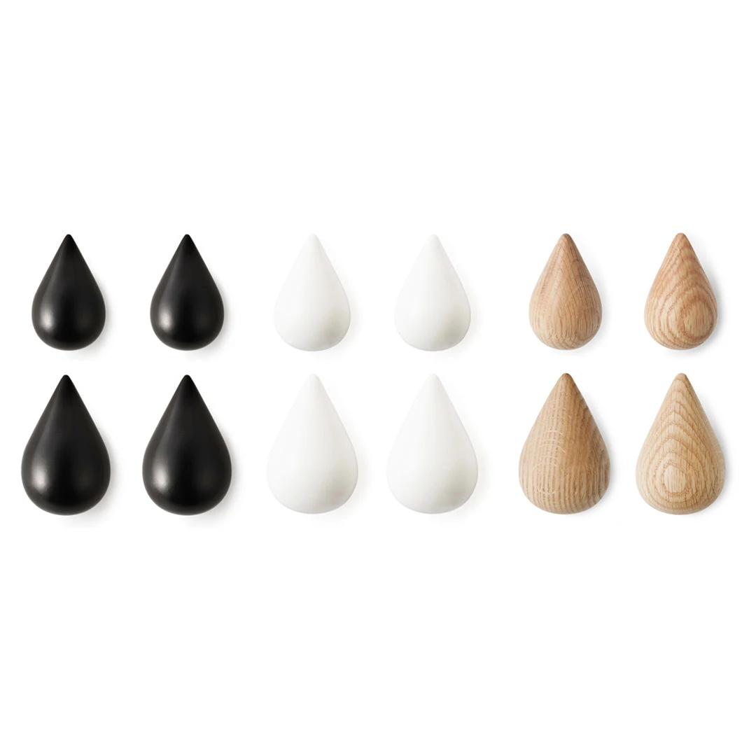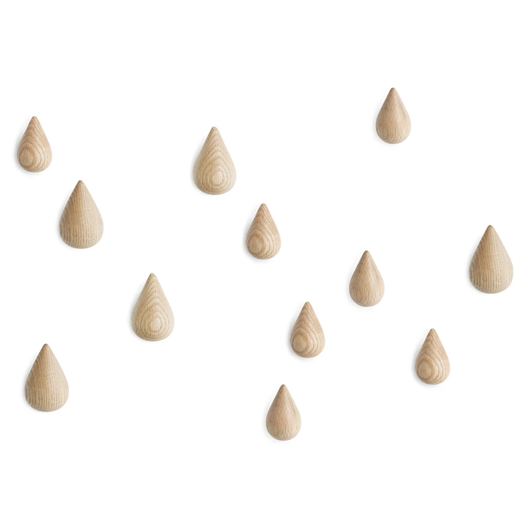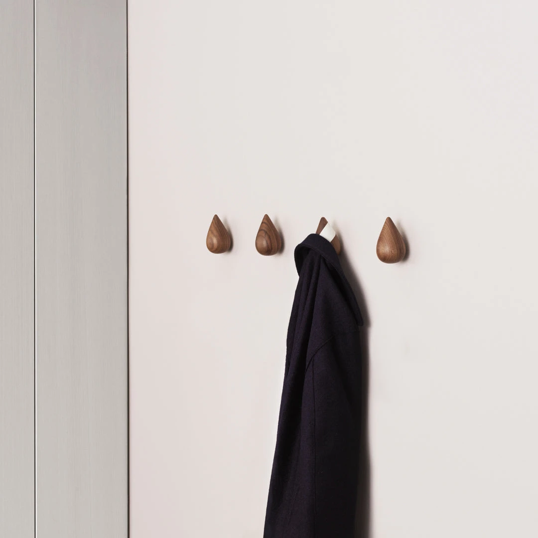 The Dropit hook is a wooden, drop-shaped hook with a strong visual expression and exquisite finish. Hang a single drop on the wall or create a pattern using several Dropit hooks.
