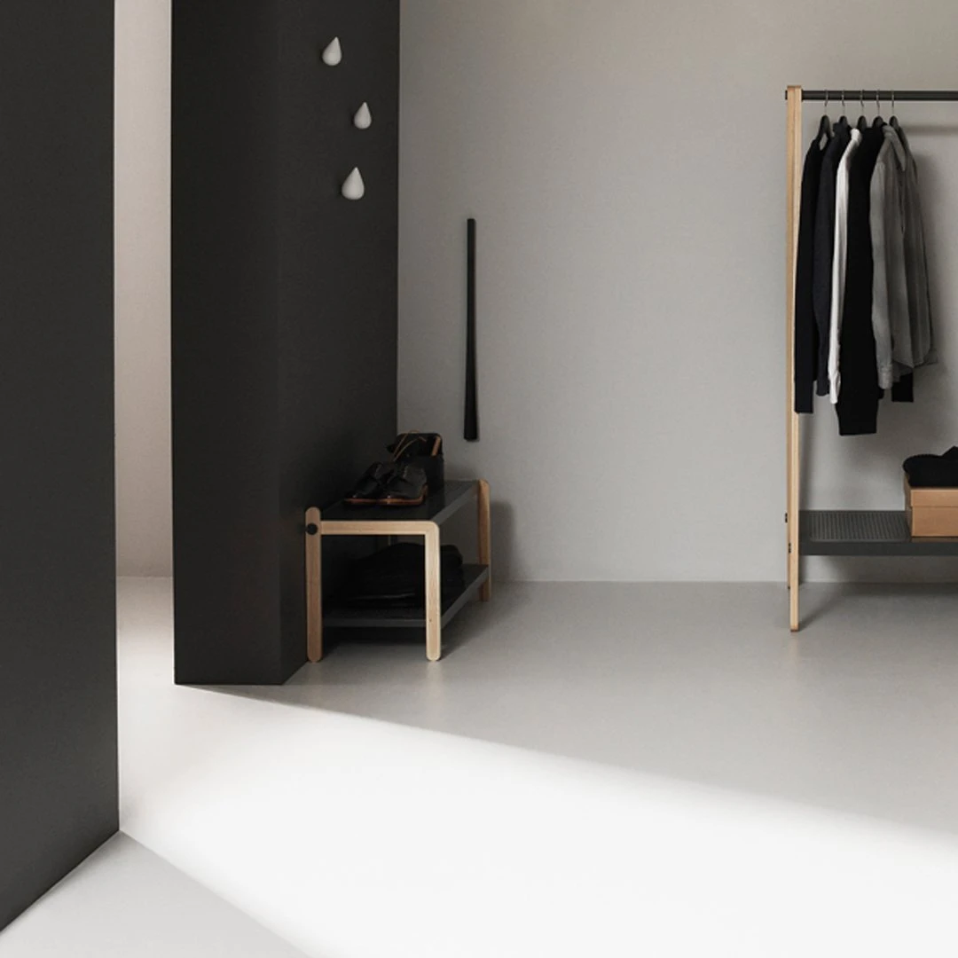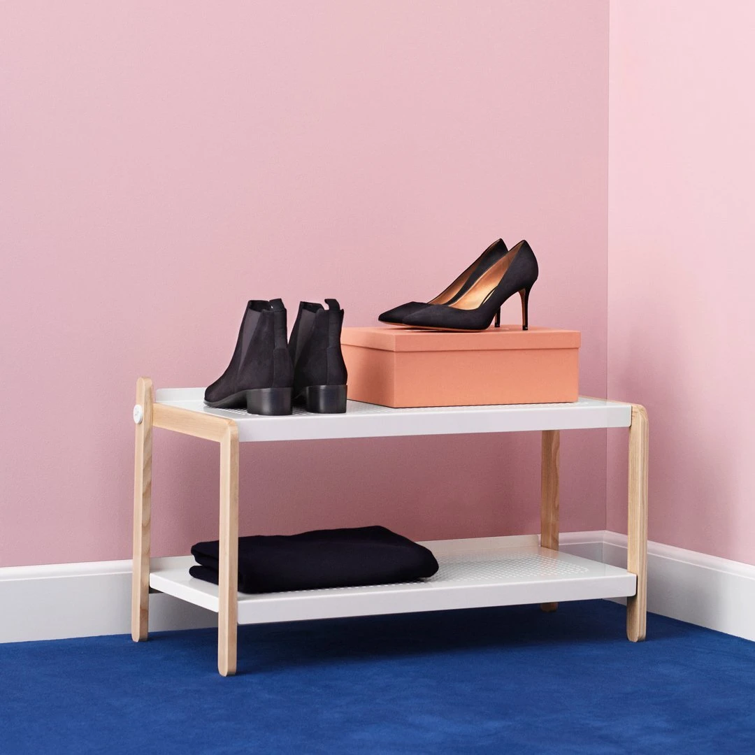 Sko is available in ash, with shelves in a pure white or intense dark grey and is perfect for places where extra storage space is needed for shoes and boots, such as the hallway and bedroom etc.