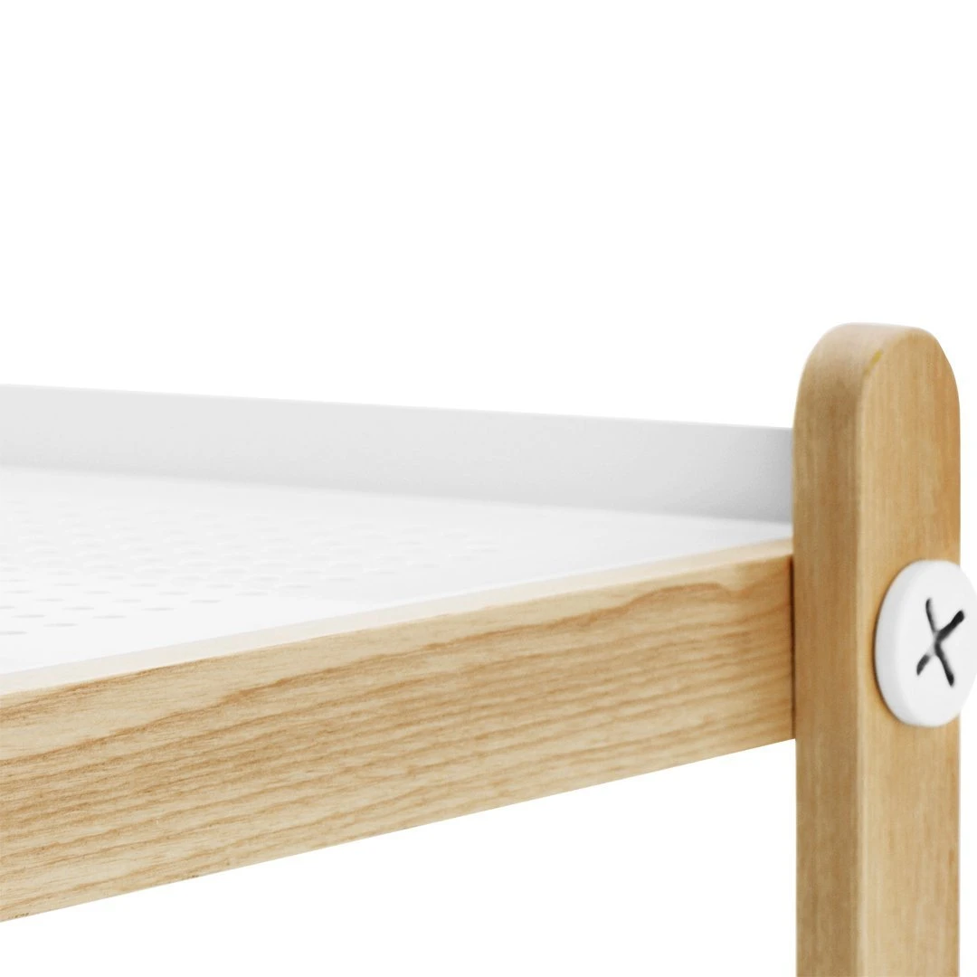 Sko is a shoe rack with both an industrial and simple feel and is made with robust, Scandinavian materials. Sko has been designed without any unnecessary components. It consists of a wooden frame with two perforated steel shelves held together by accentuated screws.
