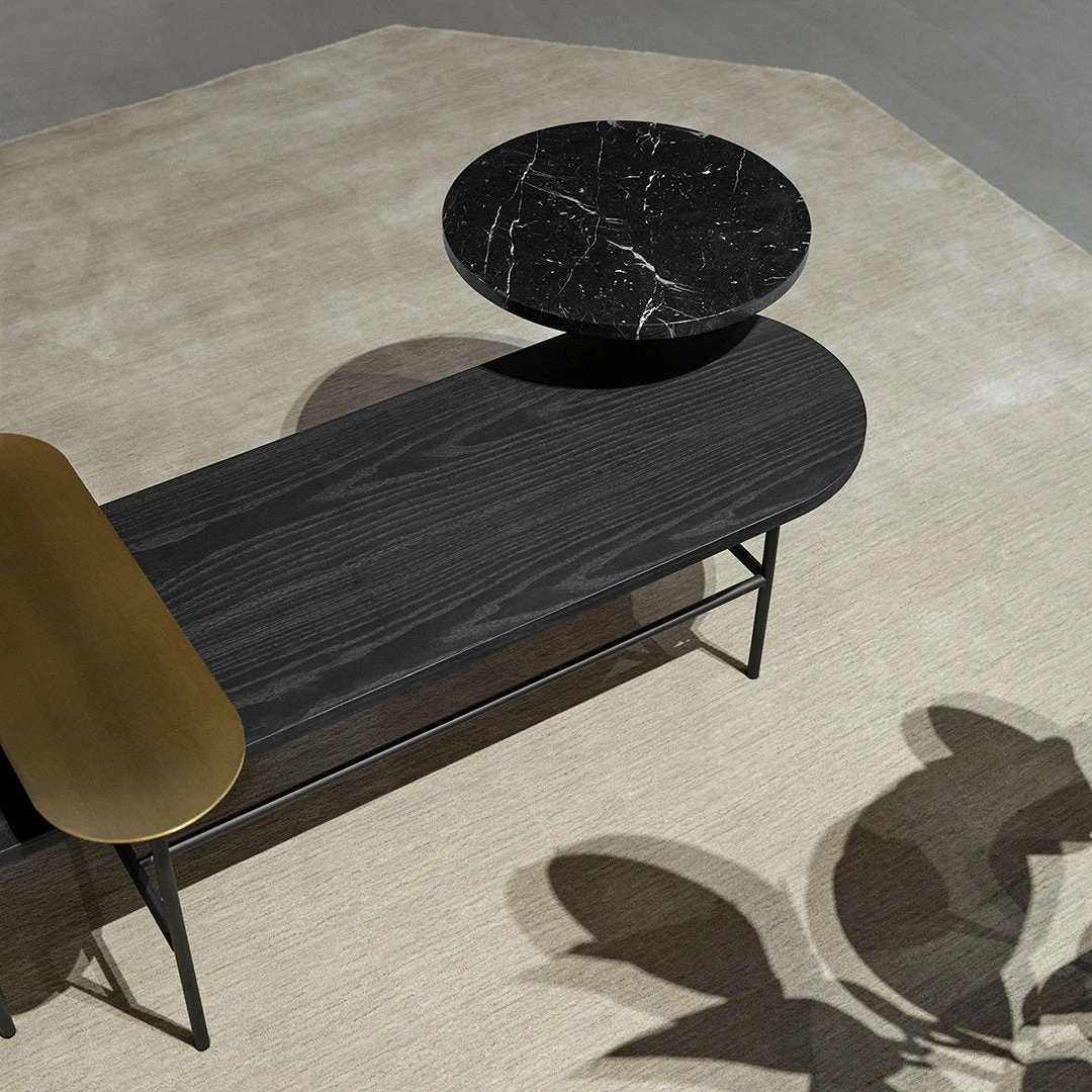 At first glance, each Hayon Lounge table is a lesson in geometry. One version features a round shape coupled with a hexagon together with an elongated oval. Another version has a painter’s palette shape, while another version juxtaposes a rounded rectangle with an elongated oval and a circle. Each table is a composition of three distinctive shapes beautifully balanced at different heights which form a unified whole.