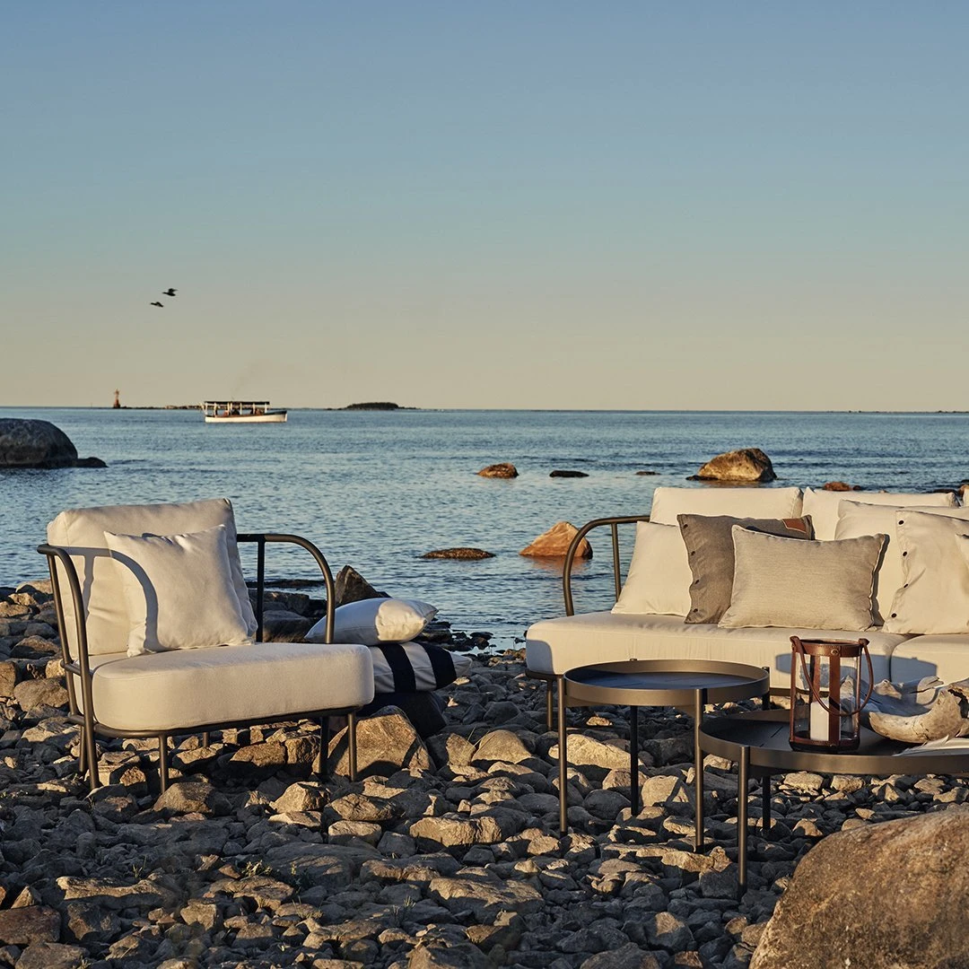 Lounge and dining range, that offers maintenance-free furniture with a distinct, Scandinavian, design. Aluminium frames, gently curved and elegant, with Sunbrella covered cushions, repelling any rain. And high quality outdoor foam, just to get rid of any humidity that could, in theory, get in via the seams.