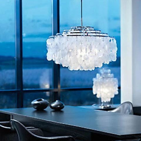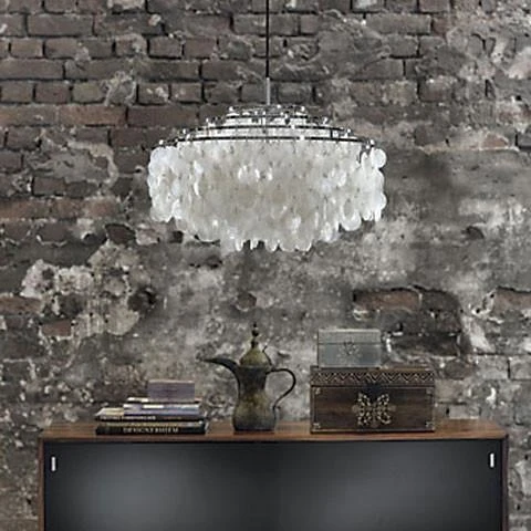 Pendant with discs on five ring metal frame. Discs are connected with small rings. Incl. ceiling canopy.