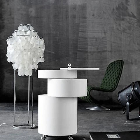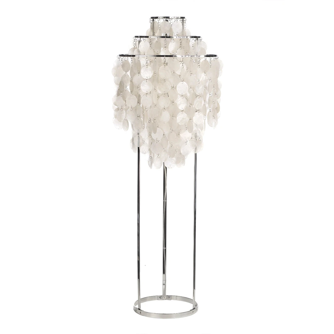 Floor lamp with discs on three ring metal frame. Discs are connected with small rings.