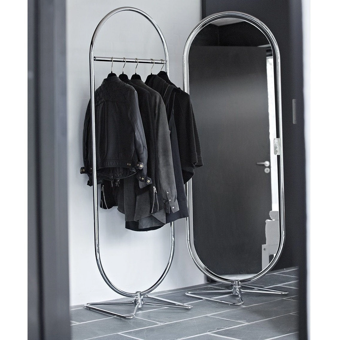 Oval shaped clothing rack for hangers. Turns 360 degrees.