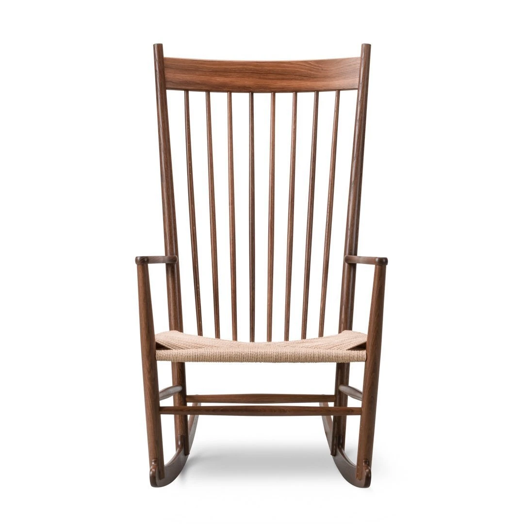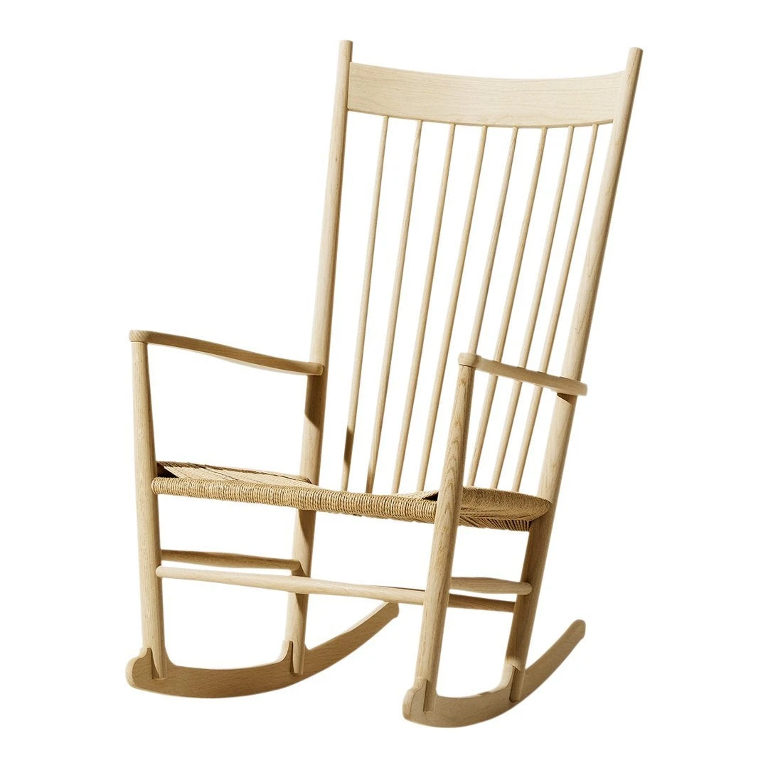 Designed in 1944, Wegner ‘s rocker with the sensually curved arms was inspired by traditional Windsor and Shaker furniture, fused with Wegner’s poetic lines.
