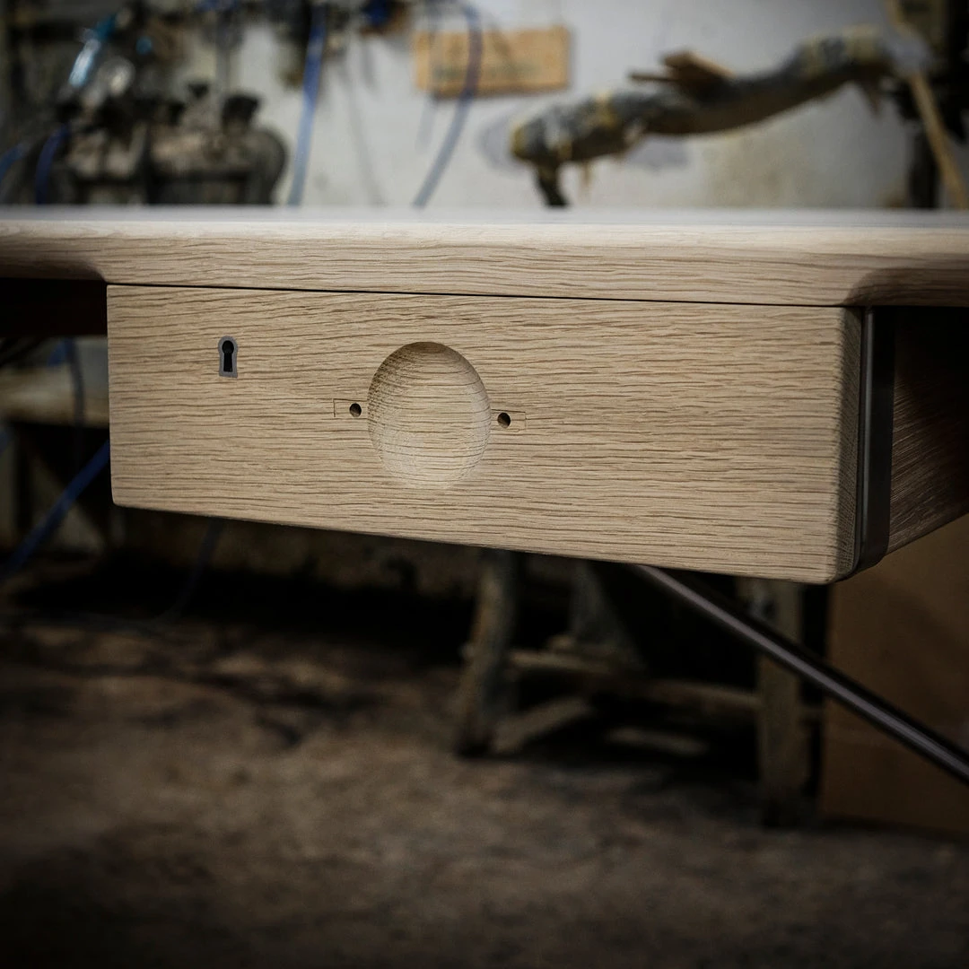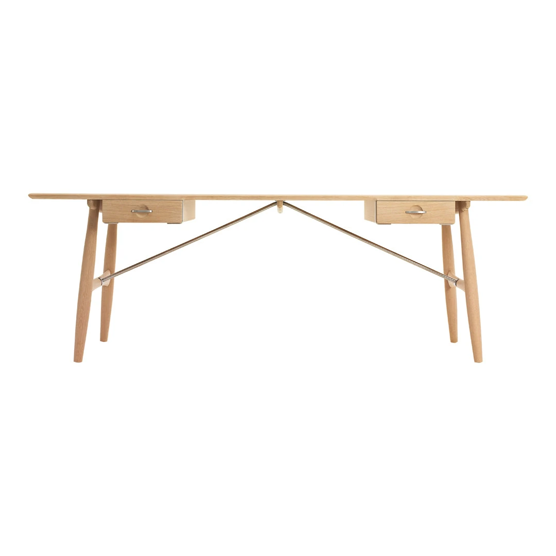 The desk marks the beginning of Wegner’s work on combining sharp steel and sculptural solid wood in most elegant and well-balanced solutions. In this respect the desk precedes such unique classics as the Swivel Chair, the Cross Legged Table and the pp75 table.